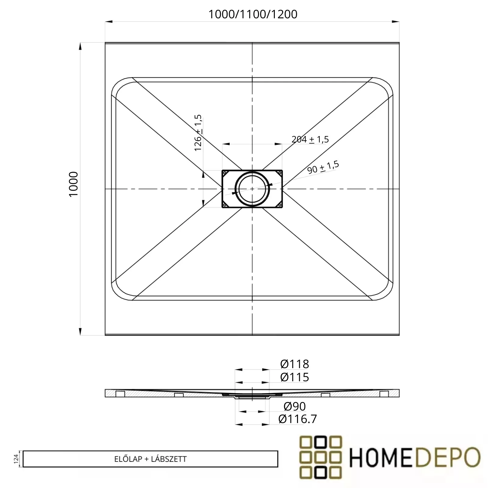 - Tartozékok: SMC kőhatású zuhanytálca, krómozott zuhanylefolyó rács, színazonos kőhatású SMC lefolyó takarófedél, vágható előlap, lábszett