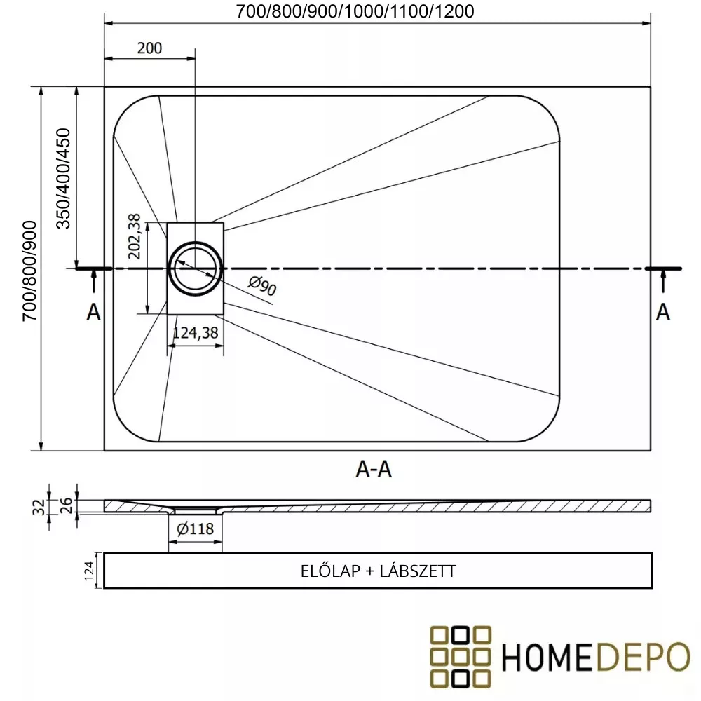 - Tartozékok: SMC kőhatású zuhanytálca, fehér zuhanylefolyó rács, színazonos kőhatású SMC lefolyó takarófedél, vágható előlap, lábszett