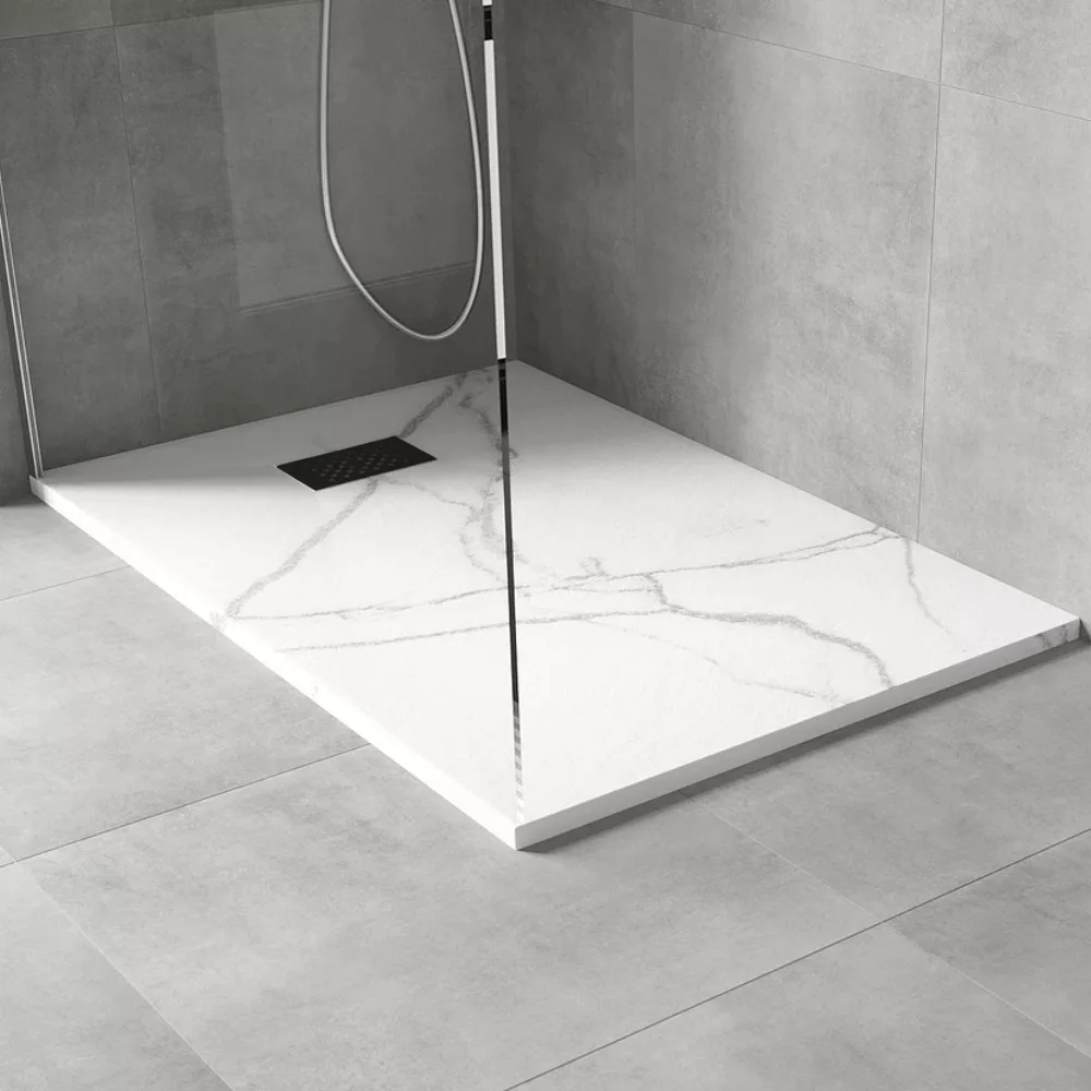 HD Marco White Marble 100x80 szögletes SMC zuhanytálca fekete zuhanylefolyó ráccsal