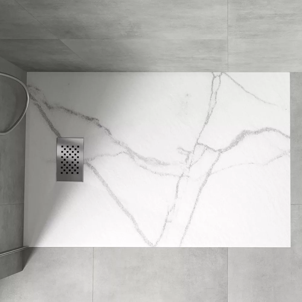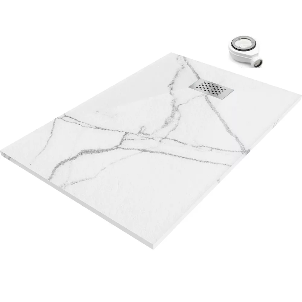 HD Marco White Marble 120x90 szögletes SMC zuhanytálca krómozott zuhanylefolyó ráccsal