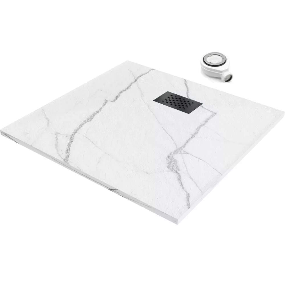 HD Marco White Marble 80x80 szögletes SMC zuhanytálca fekete zuhanylefolyó ráccsal