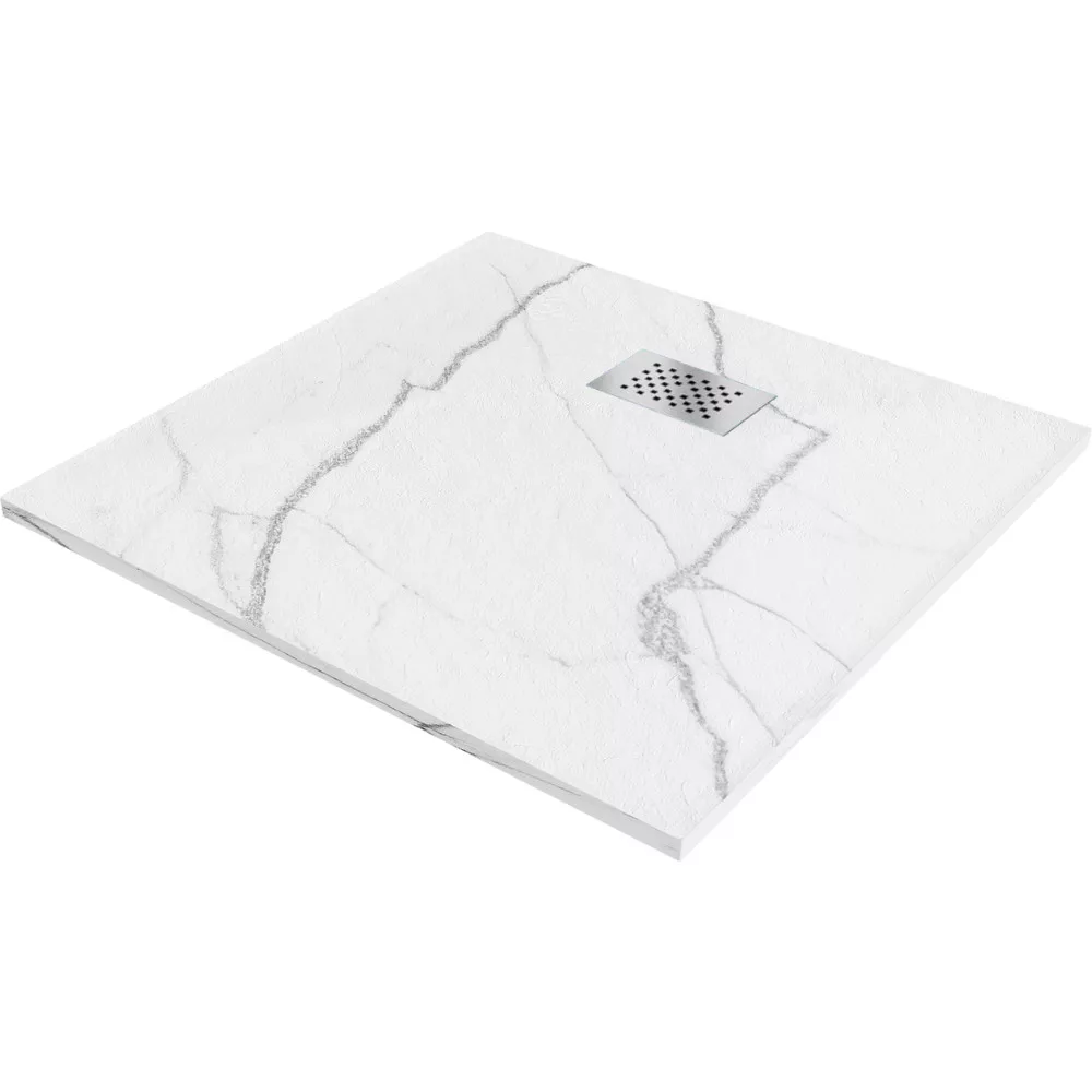 HD Marco White Marble 80x80 szögletes SMC zuhanytálca krómozott zuhanylefolyó ráccsal
