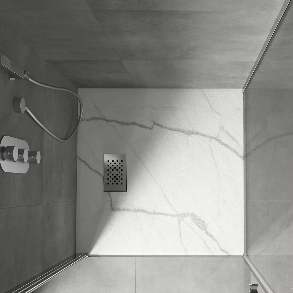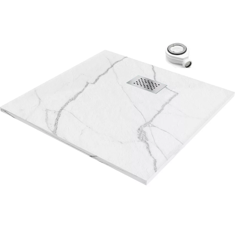 HD Marco White Marble 80x80 szögletes SMC zuhanytálca krómozott zuhanylefolyó ráccsal
