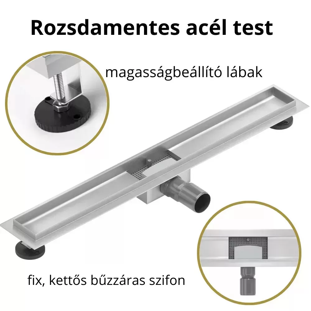 A zuhanyfolyóka kiváló minőségű alacsony szén-dioxid-kibocsátású acélból készül, amely nem csak a termék hosszútávú élettartamát és korrózióellenállóságát biztosítja, hanem lehetővé teszi a lefolyó nyugodt, gondmentes használatát.