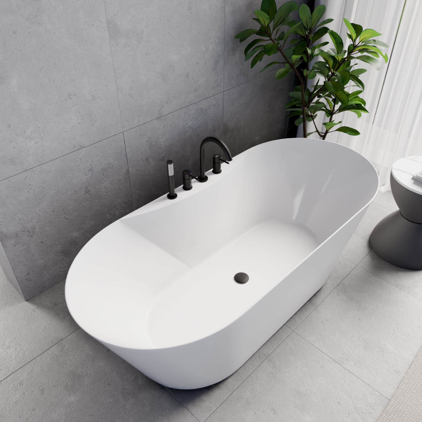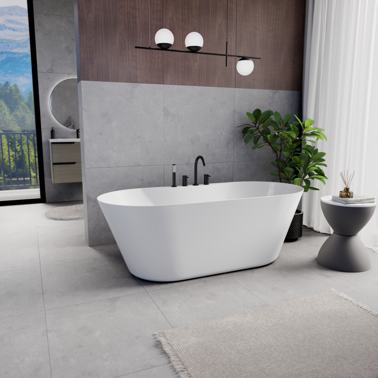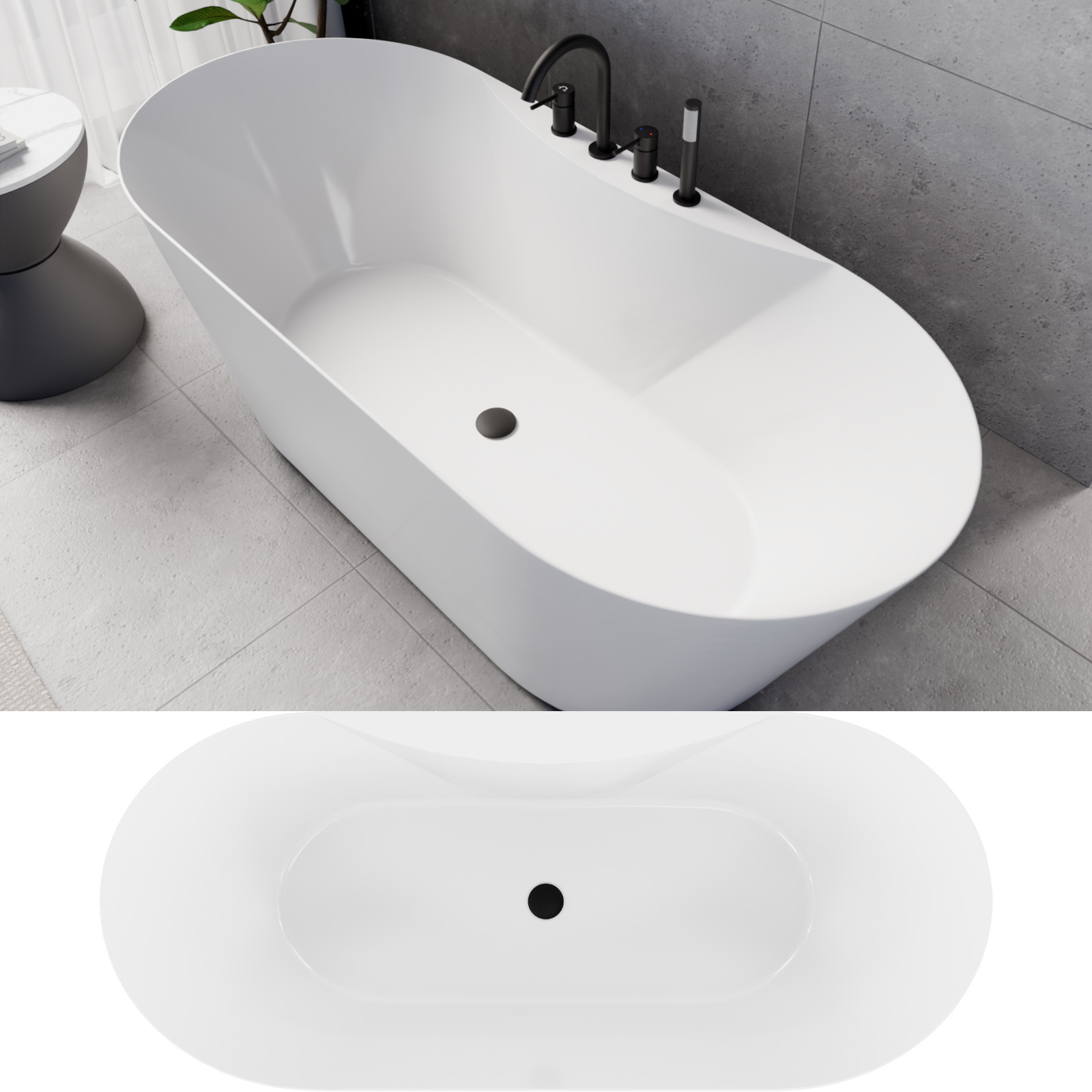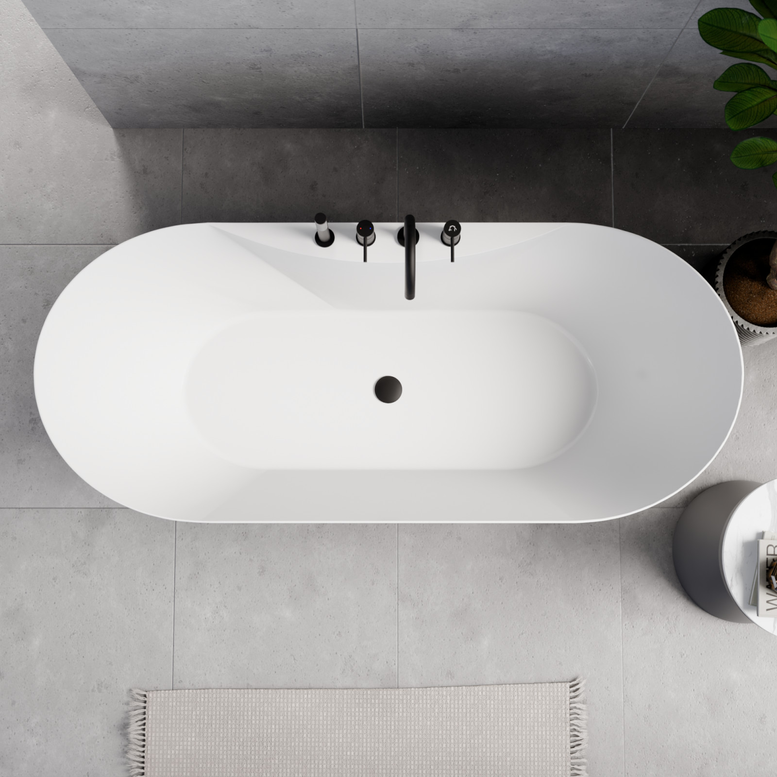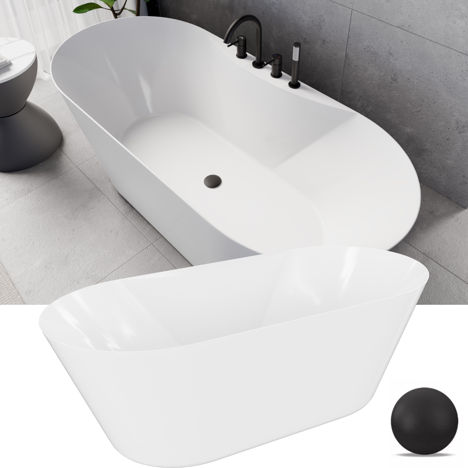 Mood ovális térben álló akril kád, 170 cm hosszú, matt fekete elemekkel