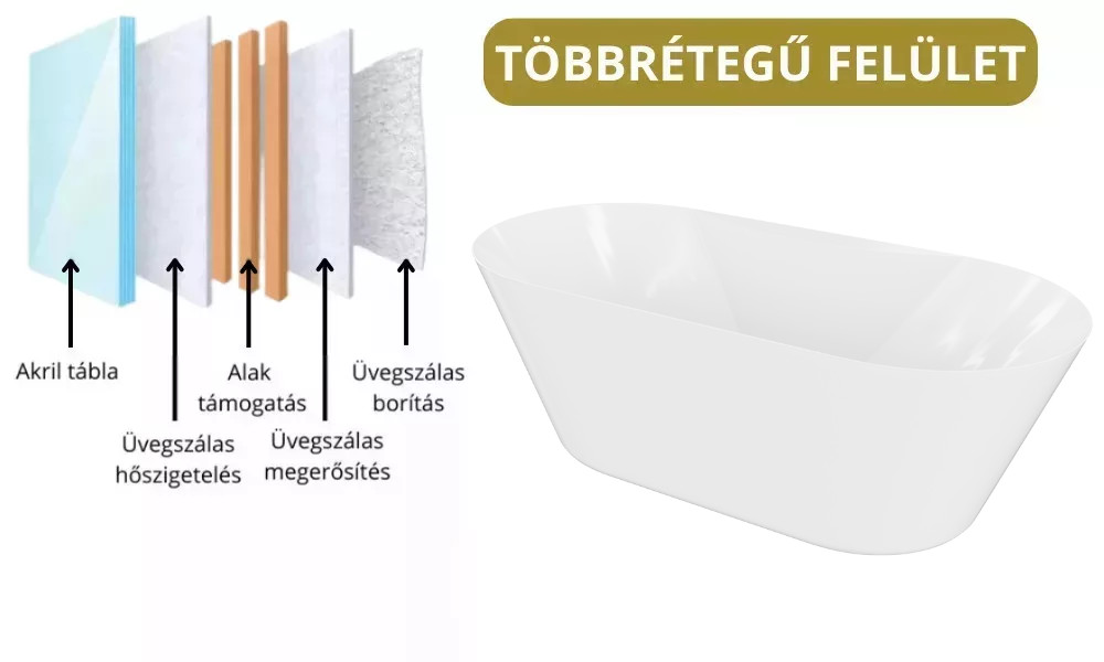A fürdőkád műgyanta-üvegszálas erősítéssel készítik gyártáskor, aminek köszönhetően rendkívüli hőszigetelő képességgel rendelkezik. Ennek nagy előnye, hogy nem hűti el a vizet a kád felülete, így garantáljuk a hosszan tartó fürdőzést.