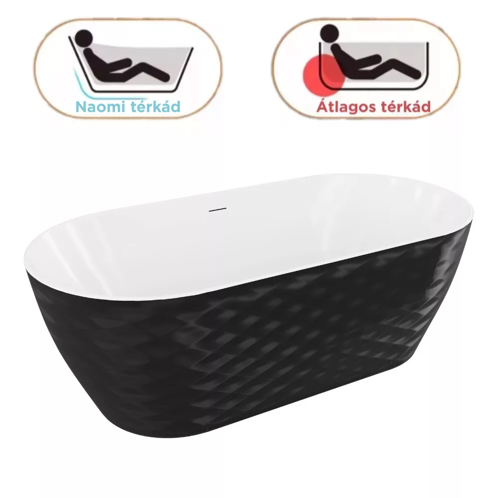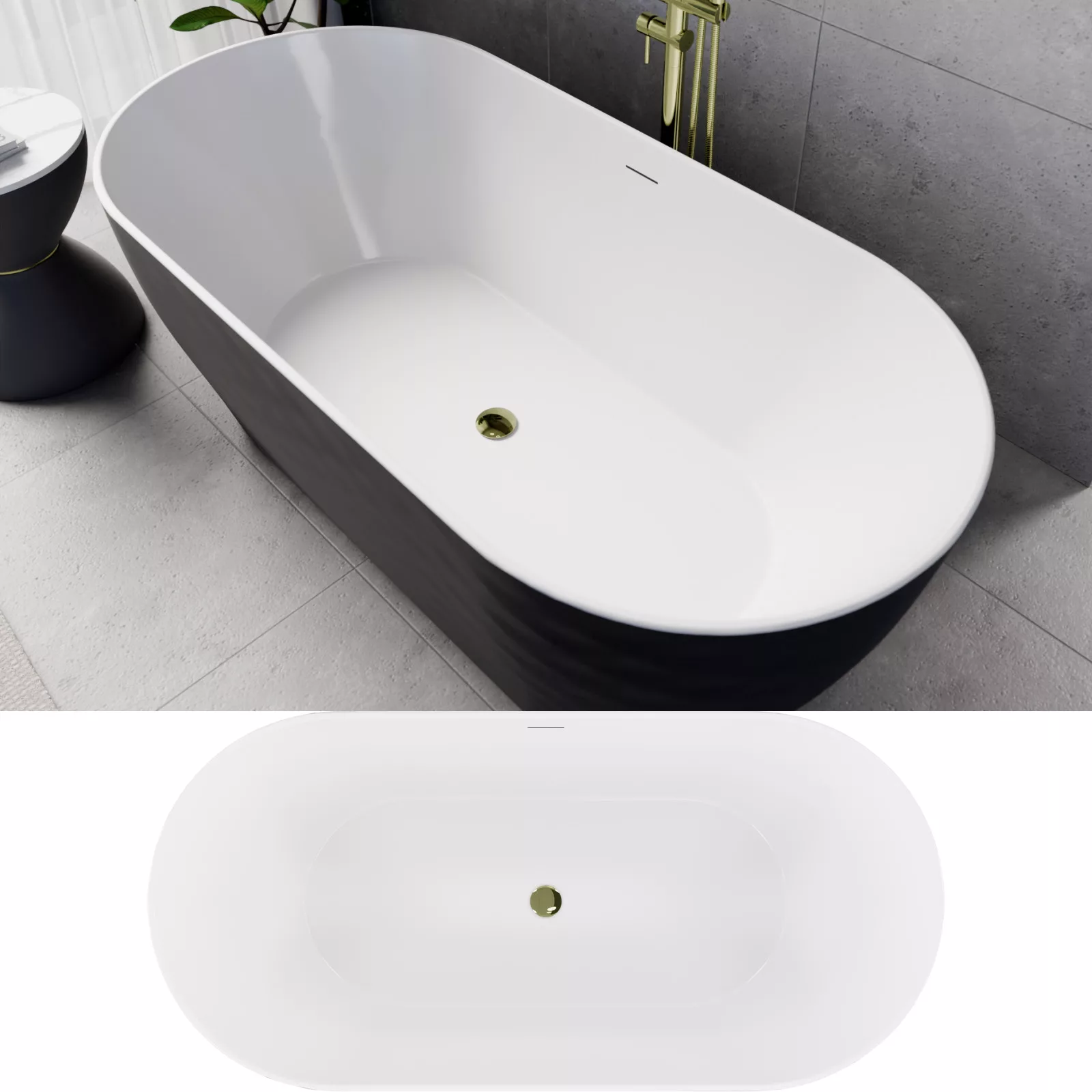 HD Naomi Black&White ovális térben álló akril kád fényes arany click-clack leeresztővel és slim túlfolyóval, 170x75x60 cm