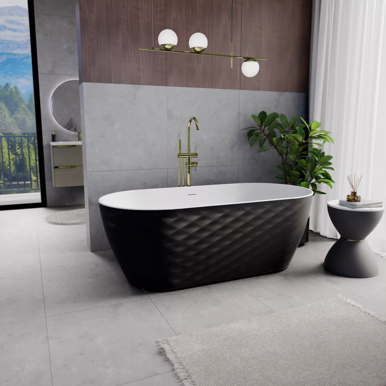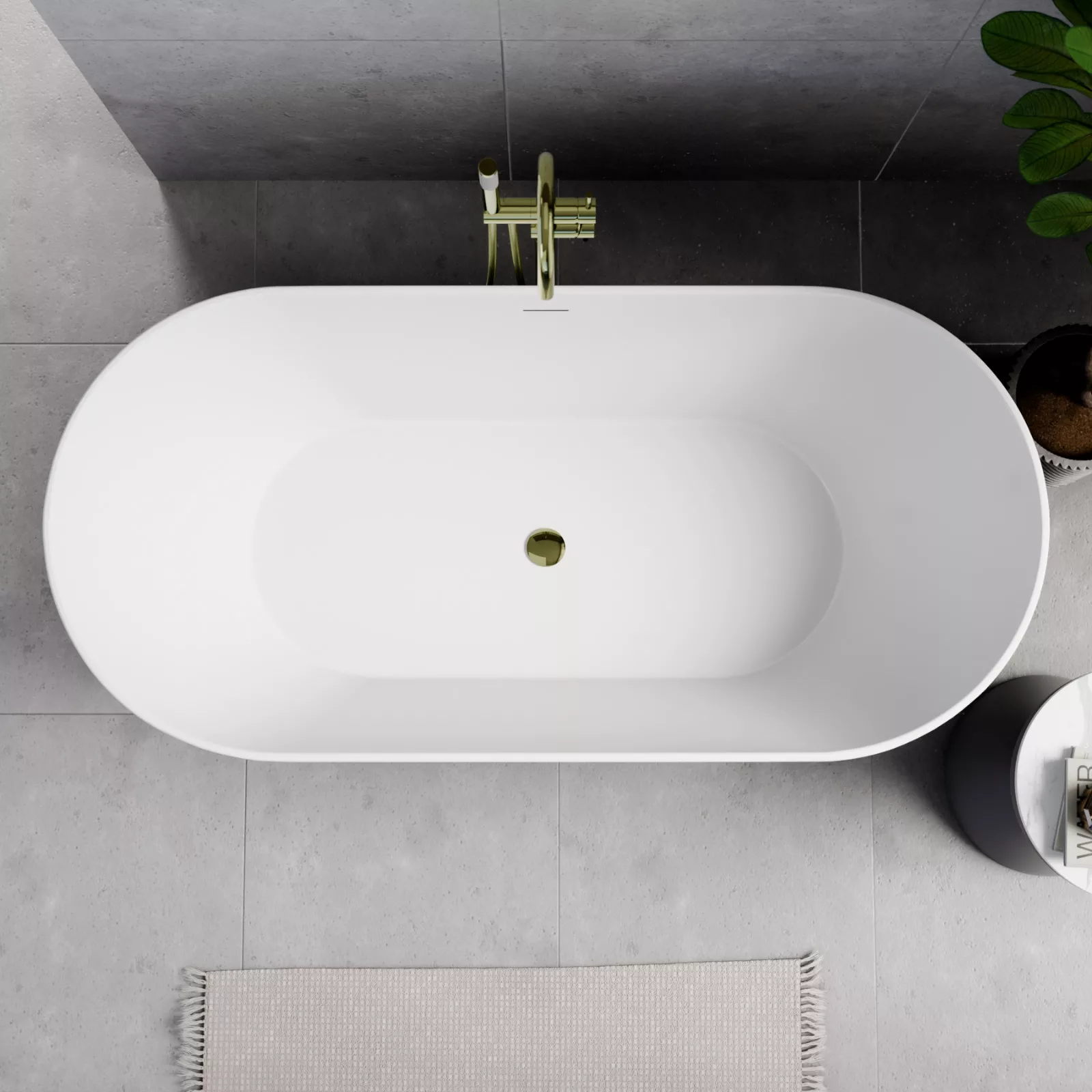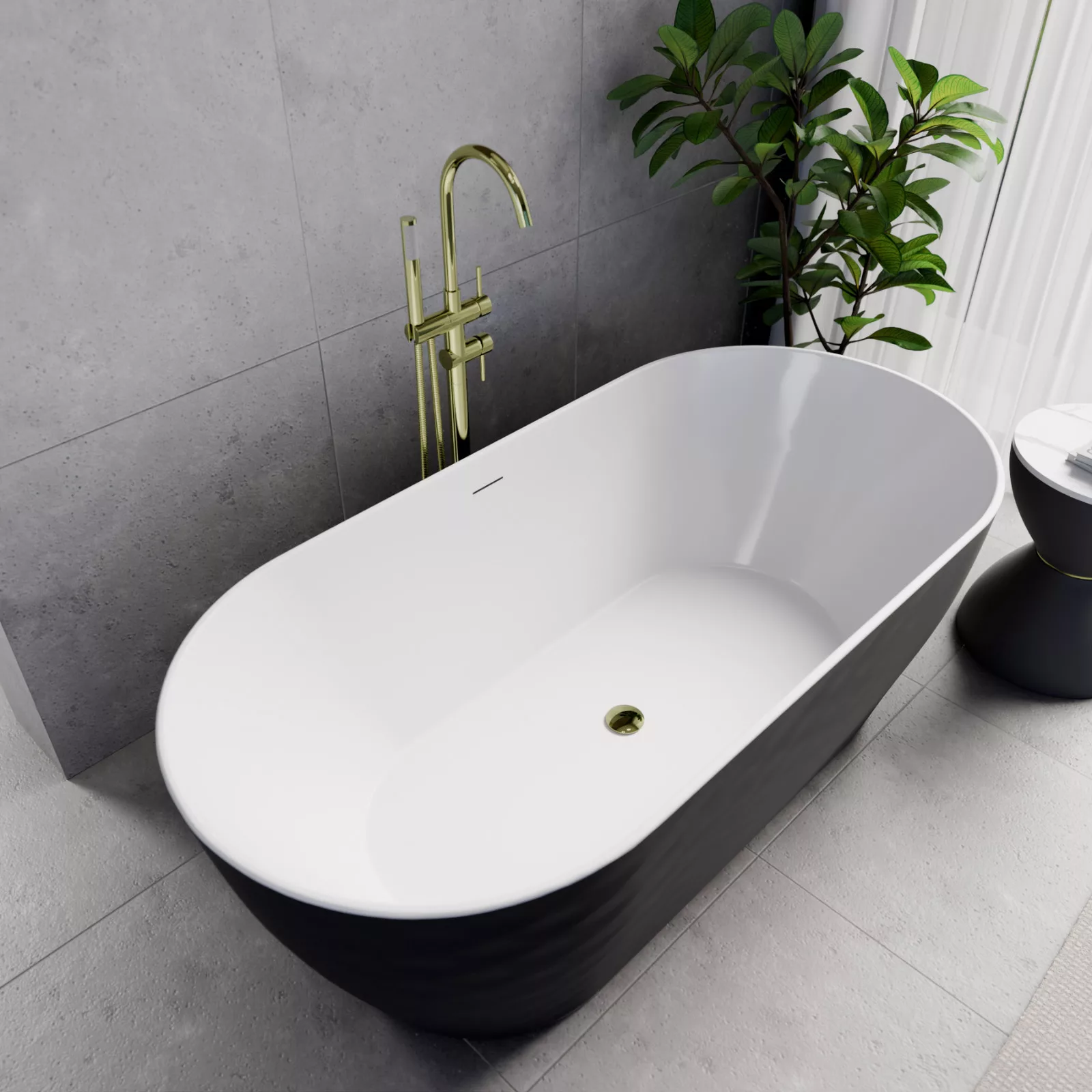 Ovális formájú térben álló hófehér akril kád fekete burkolattal, slim túlfolyóval és fényes arany click-clack leeresztővel, amely tágas, kényelmes, finoman kidolgozott egyedi kinézetének köszönhetően különlegessé teszi fürdőszobáját..