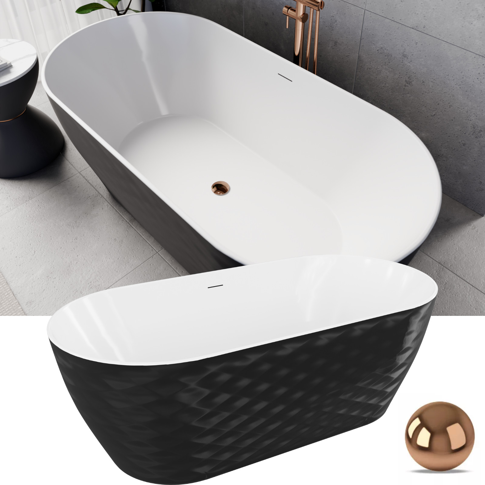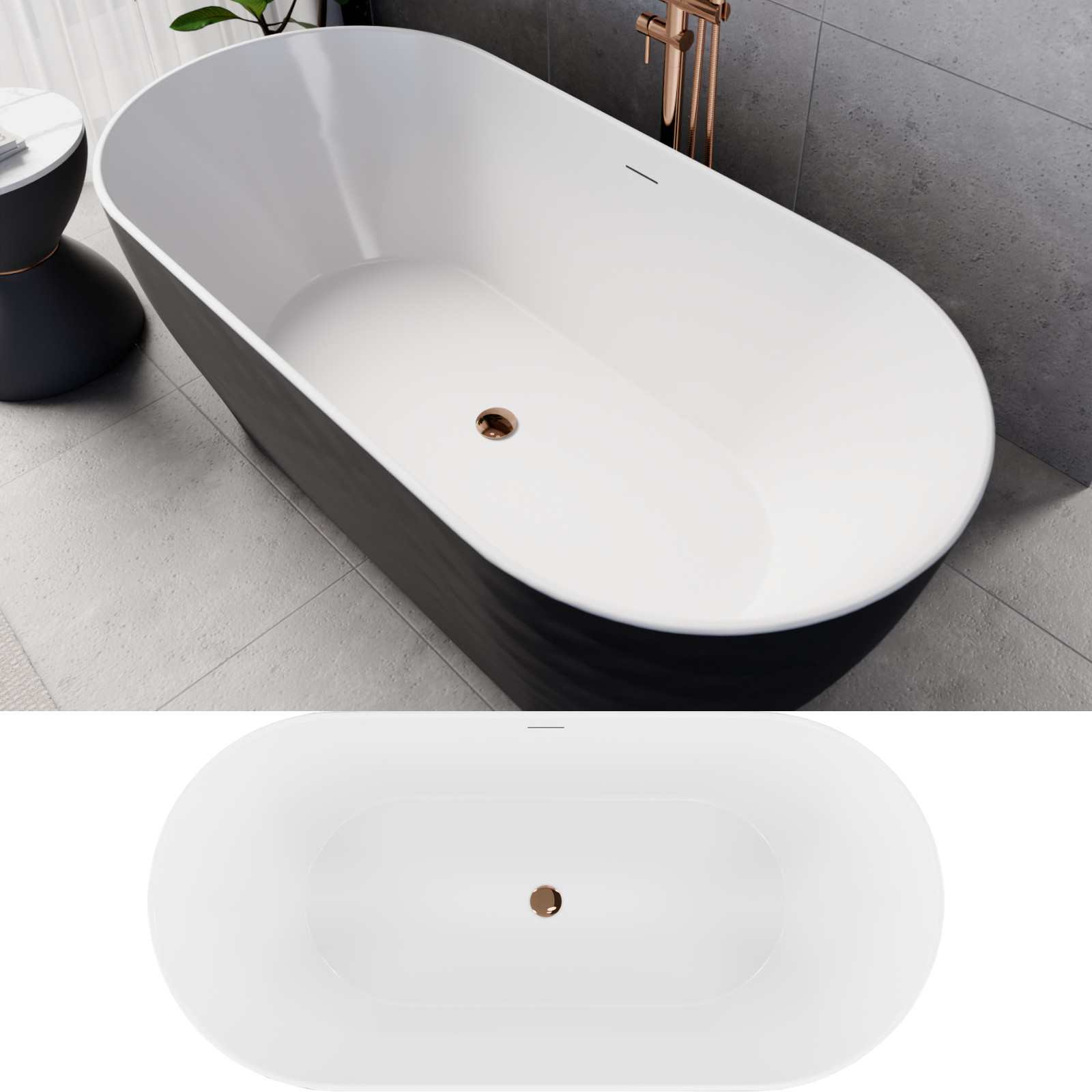 HD Naomi Black&White ovális térben álló akril kád rózsa arany click-clack leeresztővel és slim túlfolyóval, 170x75x60 cm