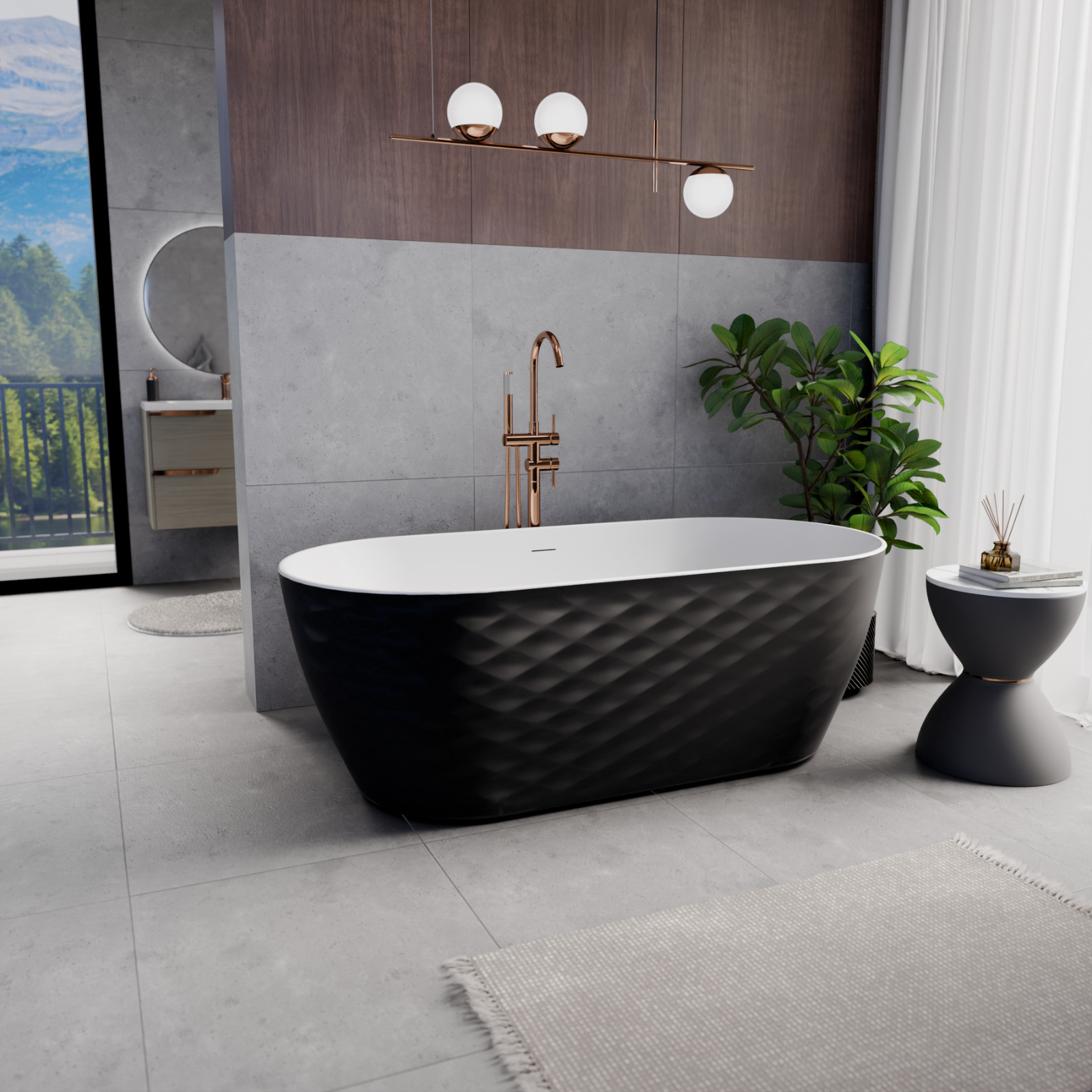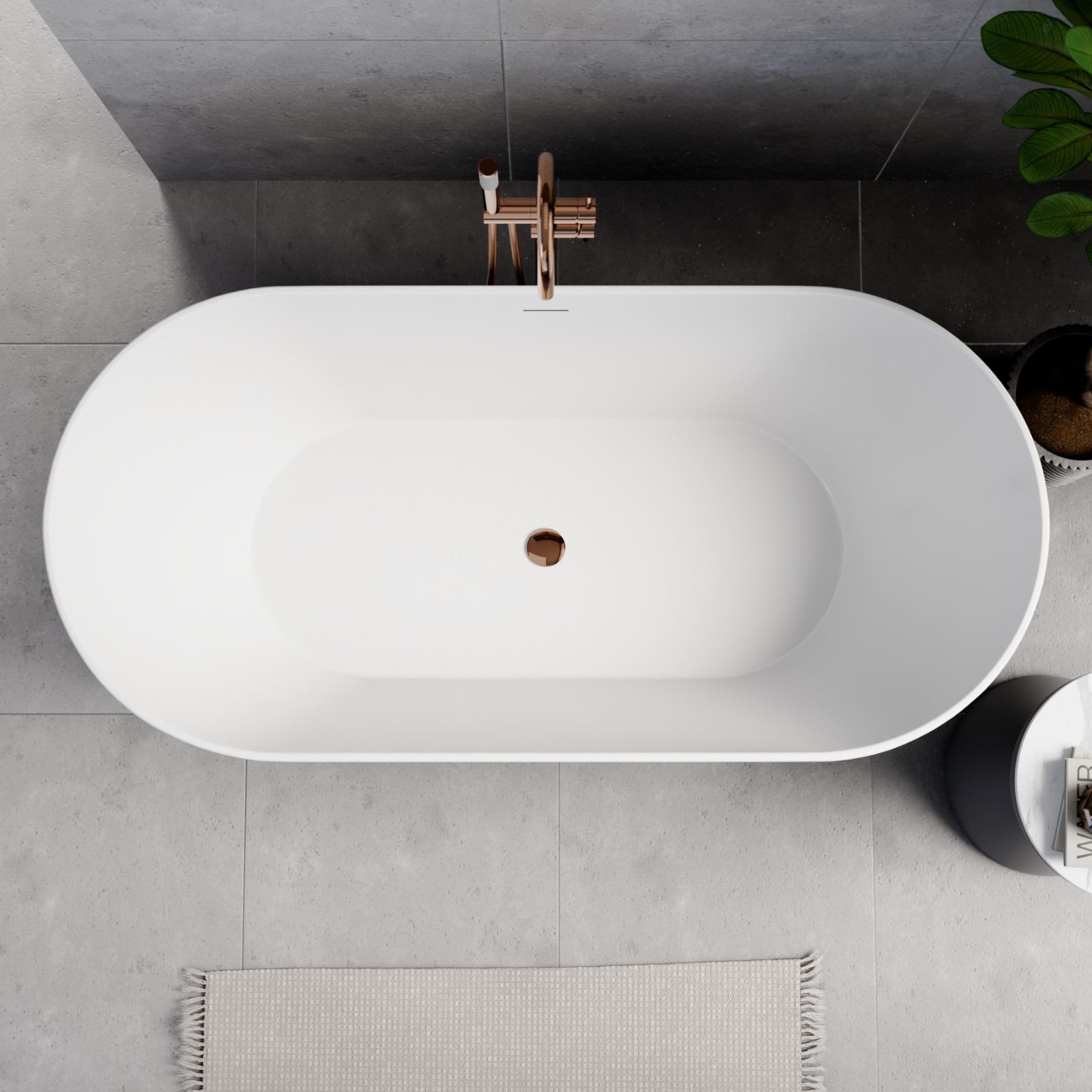 Ovális formájú térben álló hófehér akril kád fekete burkolattal, slim túlfolyóval és rózsa arany click-clack leeresztővel, amely tágas, kényelmes, finoman kidolgozott egyedi kinézetének köszönhetően különlegessé teszi fürdőszobáját..