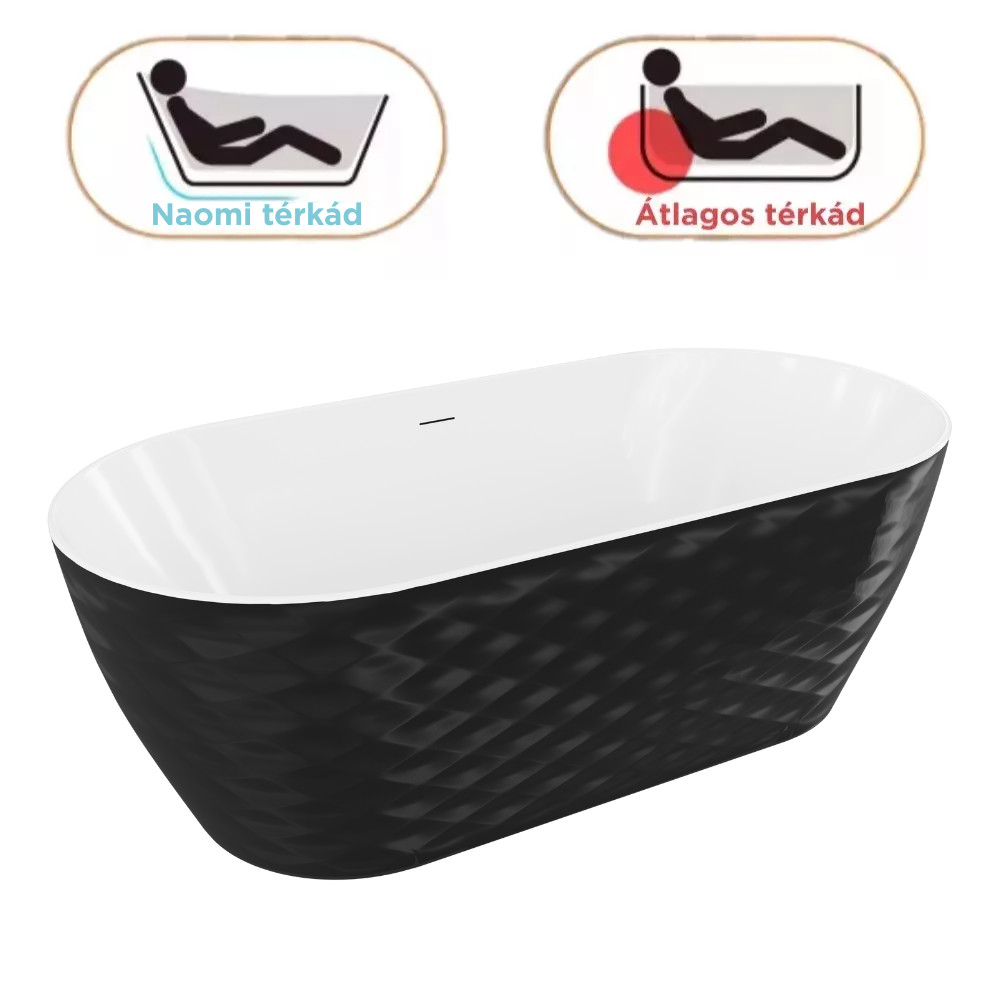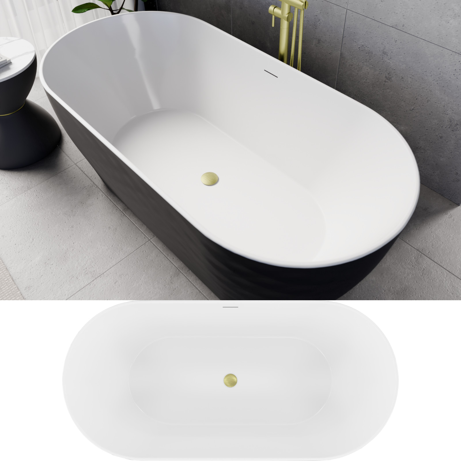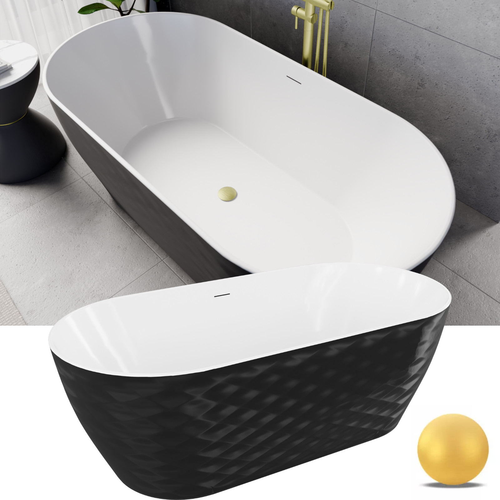 HD Naomi Black&White ovális térben álló akril kád szálcsiszolt arany click-clack leeresztővel és slim túlfolyóval, 170x75x60 cm