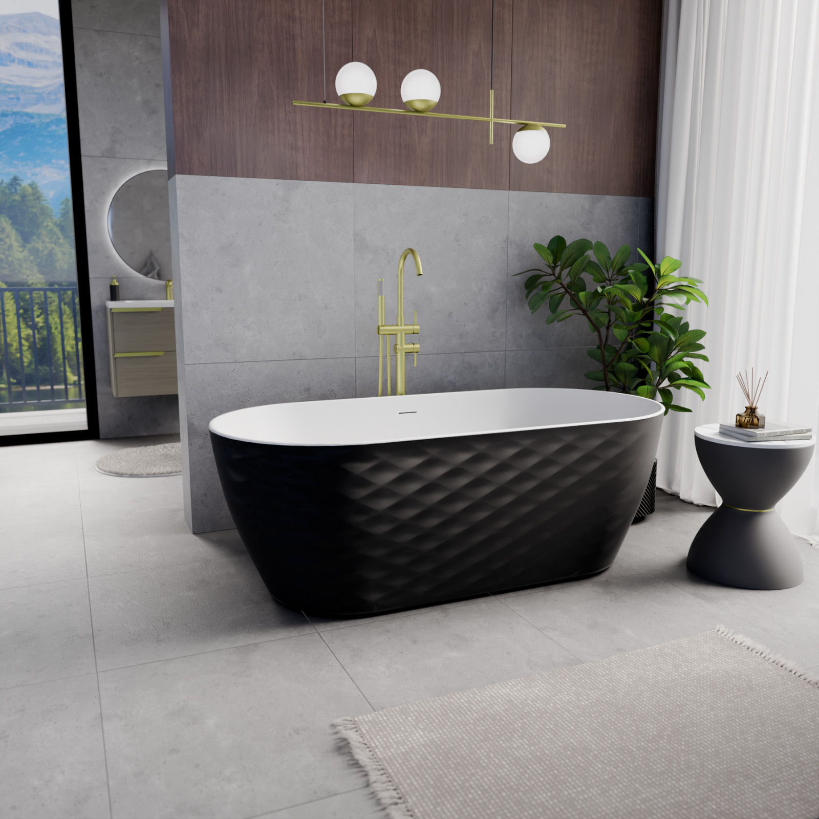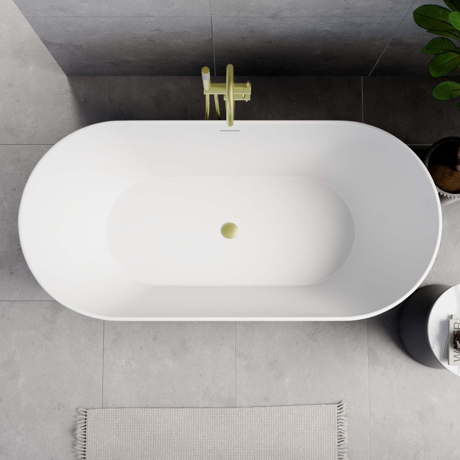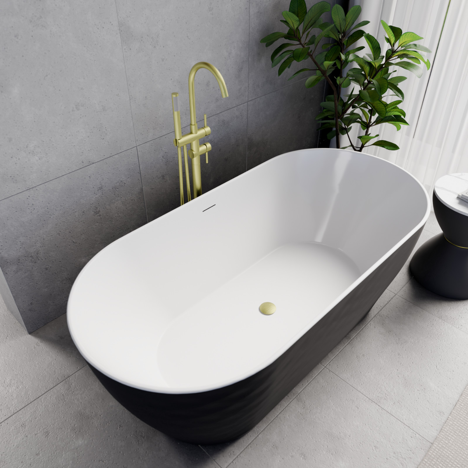 Ovális formájú térben álló hófehér akril kád fekete burkolattal, slim túlfolyóval és szálcsiszolt arany click-clack leeresztővel, amely tágas, kényelmes, finoman kidolgozott egyedi kinézetének köszönhetően különlegessé teszi fürdőszobáját..