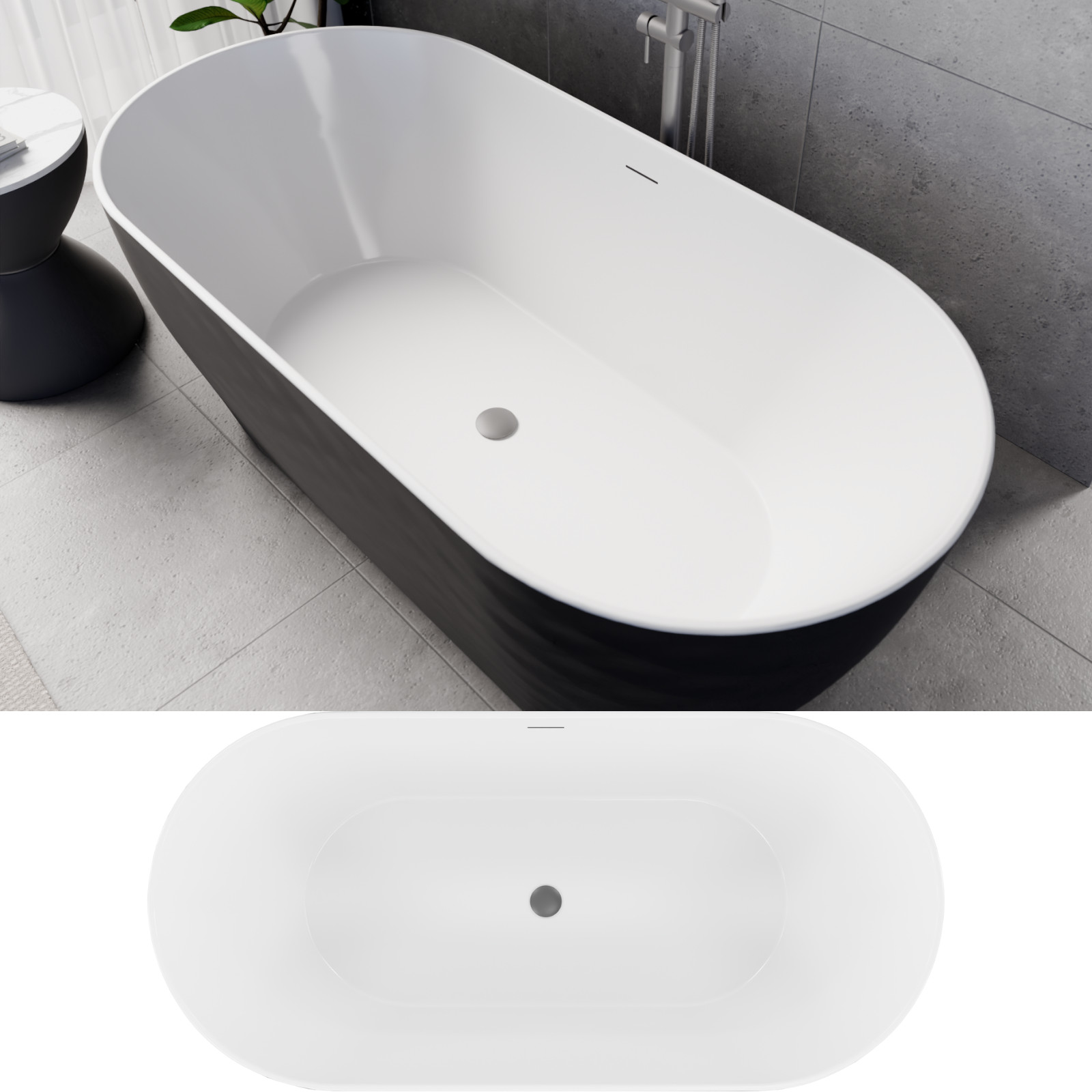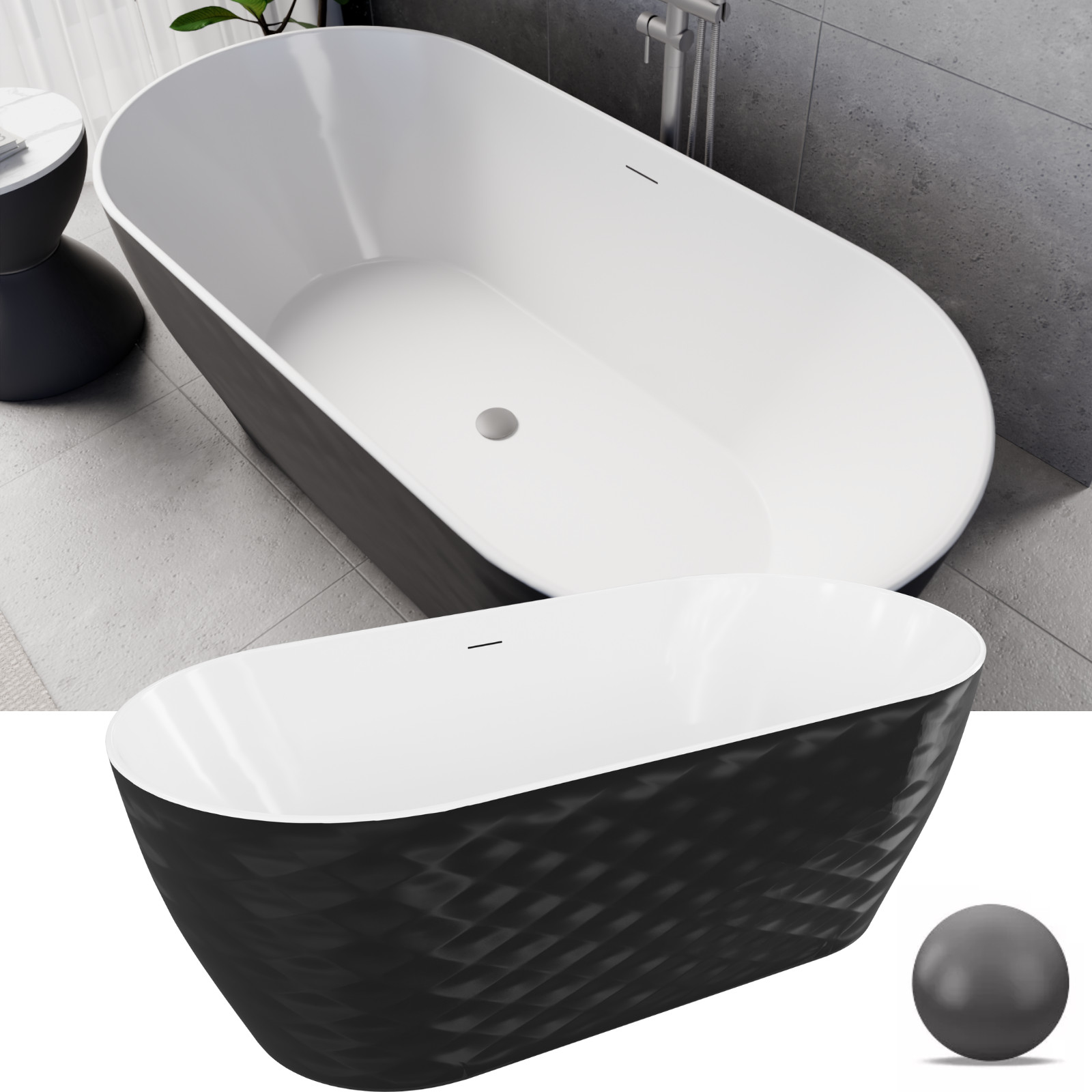 HD Naomi Black&White ovális térben álló akril kád szürke click-clack leeresztővel és slim túlfolyóval, 170x75x60 cm