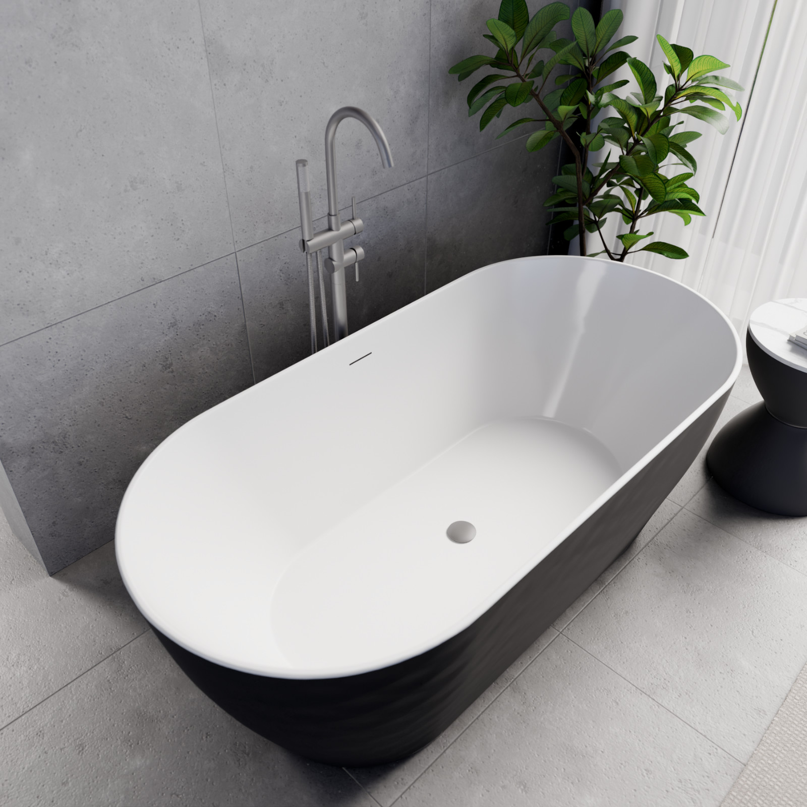 Ovális formájú térben álló hófehér akril kád fekete burkolattal, slim túlfolyóval és fegyver szürke click-clack leeresztővel, amely tágas, kényelmes, finoman kidolgozott egyedi kinézetének köszönhetően különlegessé teszi fürdőszobáját..