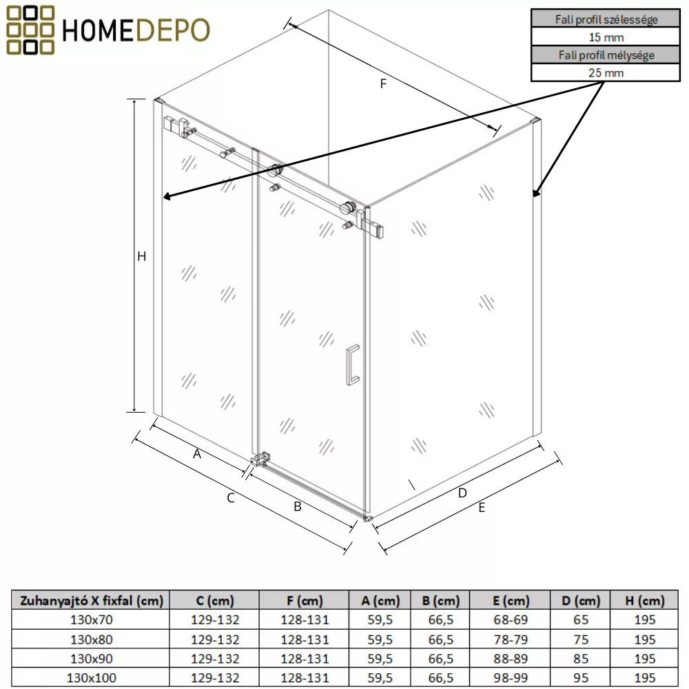 - Szélesség: 130 cm (zuhanyajtó)