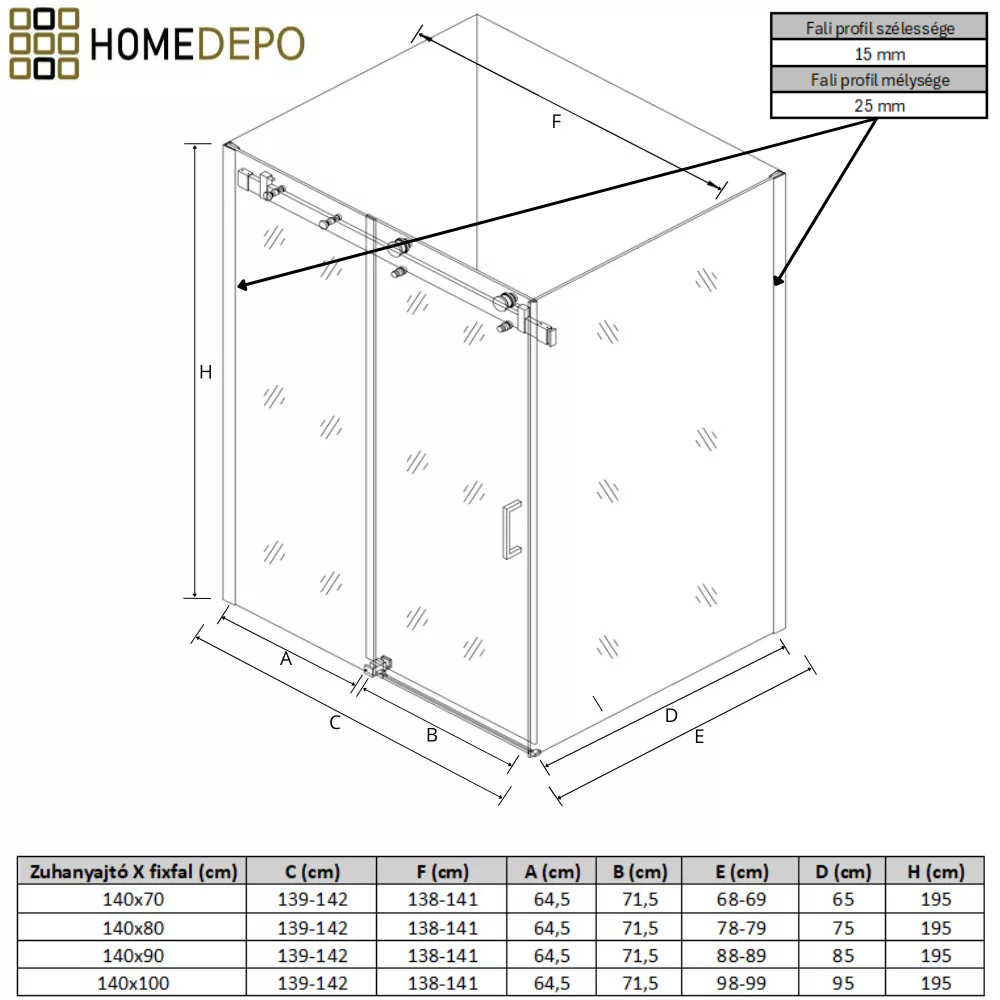 - Szélesség: 140 cm (zuhanyajtó)