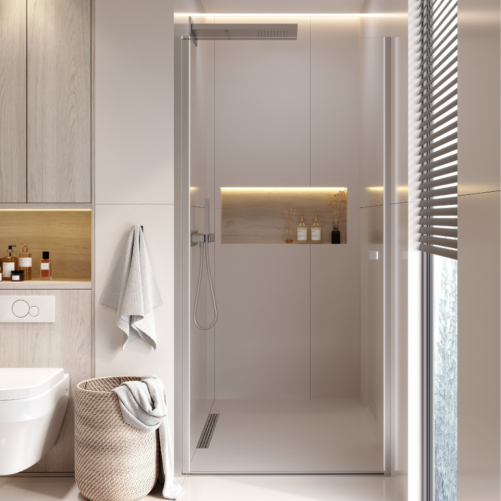 A Pivot rendszernek köszönhetően az ajtó kifelé vagy befelé nyitható egyaránt 180 fokban. Ez a megoldás rendkívül praktikus kisebb méretű fürdőszobákban is, ahol elsődleges szempont a megfelelő mértékű helykihasználás.