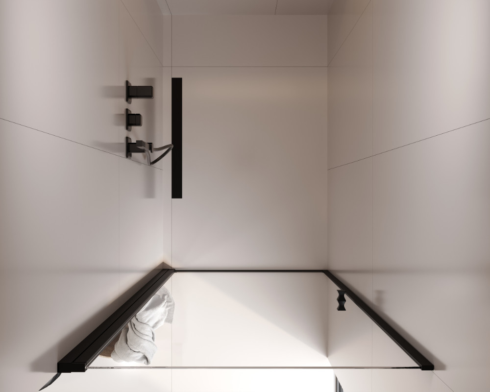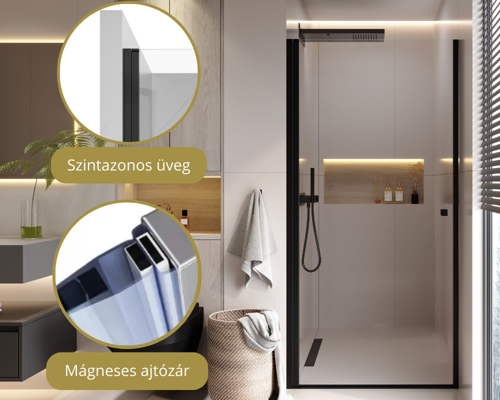 - A zuhanyajtó elemei: Polírozott állítható fekete színű alimínium profilok, prémium forgó profil emelő szerkezet, fekete színű rozsdamentes acél ajtónyitó, vízzáró szilikon profilok, fekete színű alumínium küszöb, mágneses ajtózár