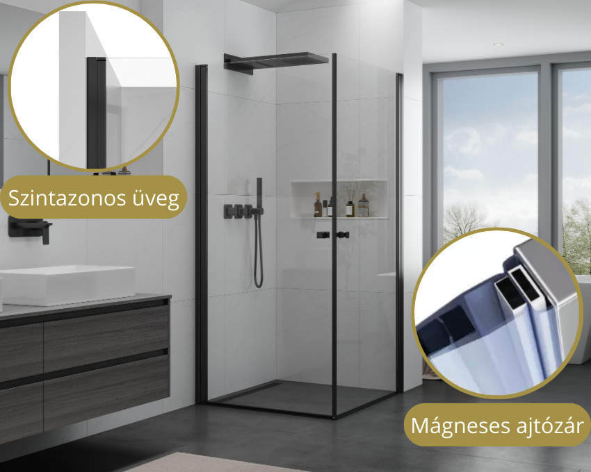A fekete színű zsanéroknak köszönhetően a zuhanyajtól szabadon csukhatók össze, aminek segítségével könnyedén léphetünk be a zuhanytérbe és ki a zuhanyzás végeztével.