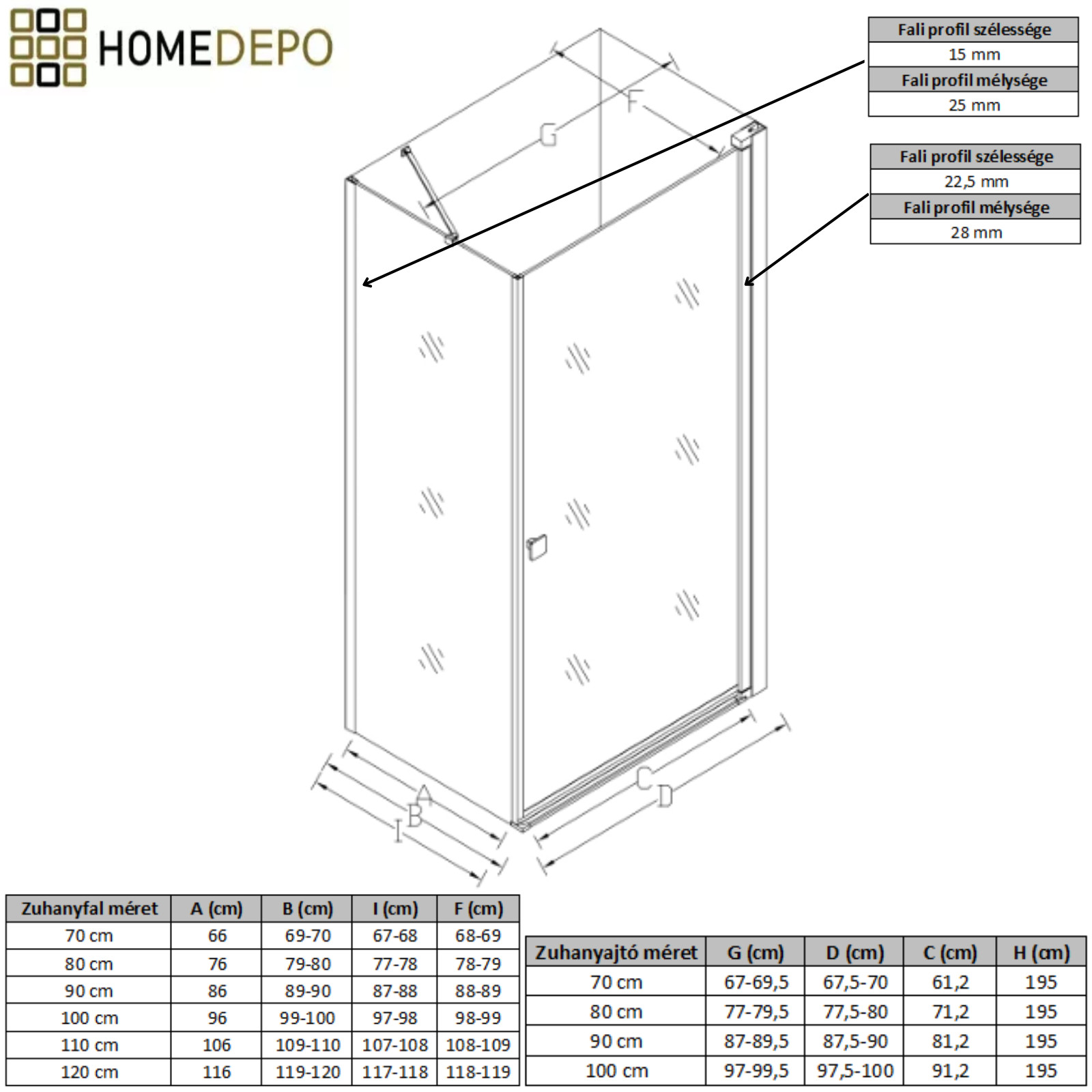 - Fali profil mélysége: Fix üvegnél: 25 mm; Zuhanyajtónál: 28 mm