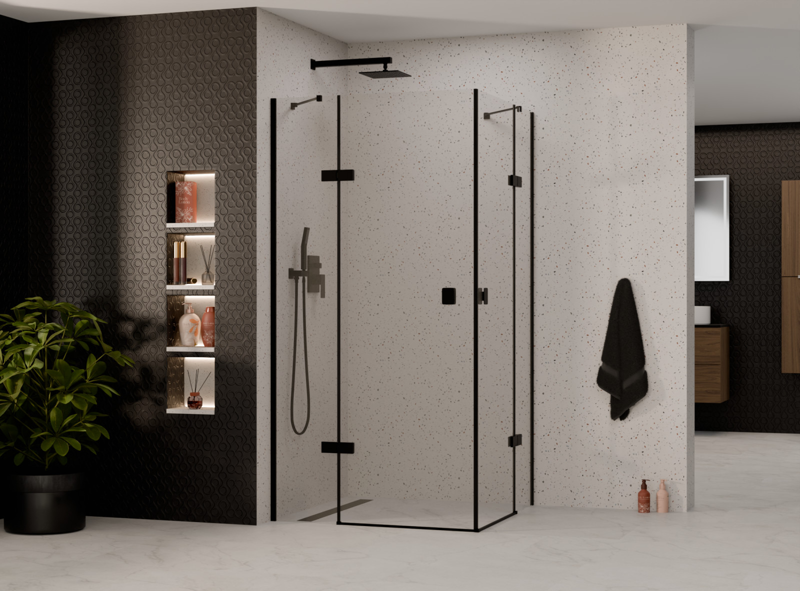 A fekete zsanéroknak köszönhetően a zuhanykabinhoz tartozó ajtók nyíló része szabadon nyithatóak kifelé, aminek segítségével könnyedén léphetünk be a zuhanytérbe és ki a zuhanyzás végeztével.