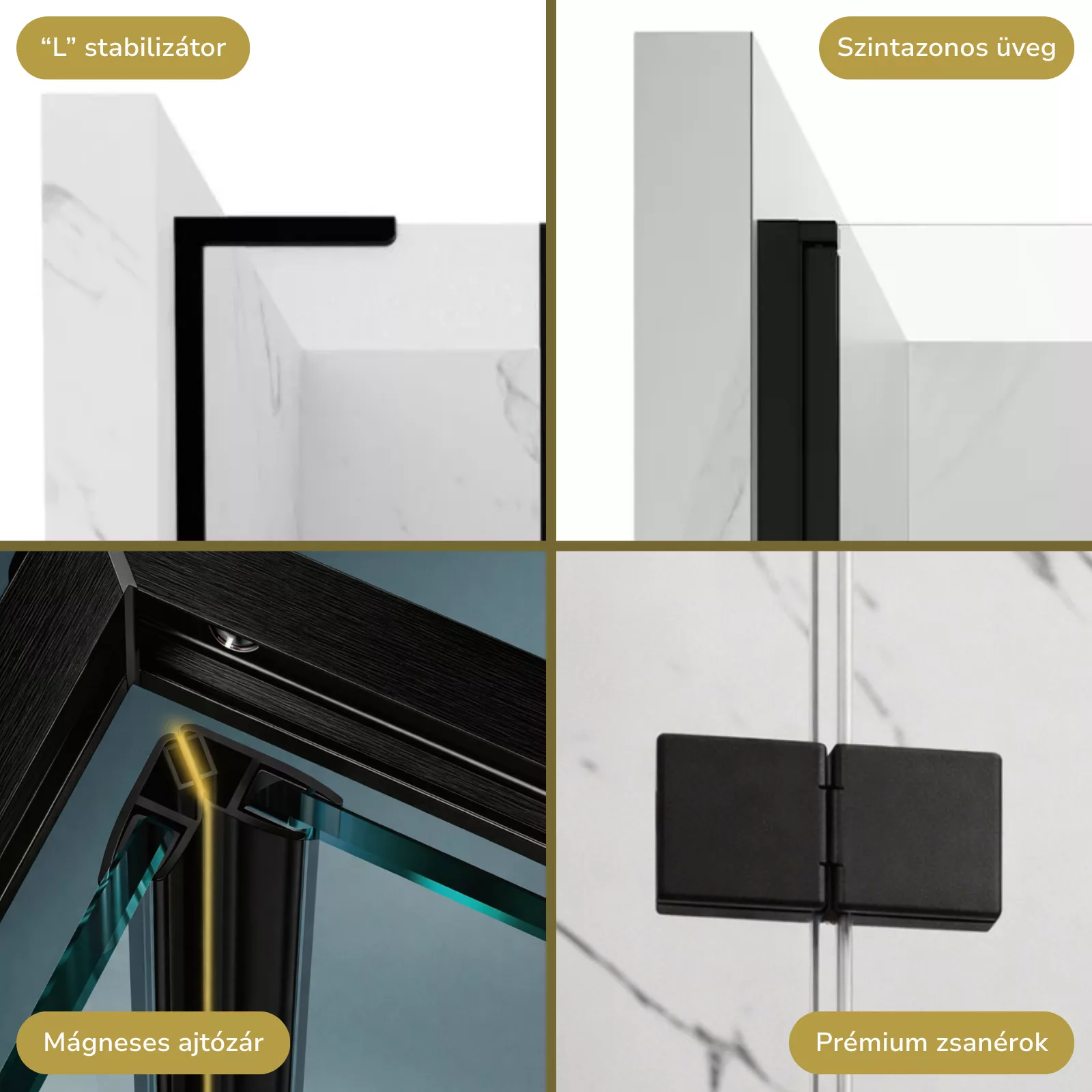 - A zuhanyajtó elemei: Állítható matt fekete alimínium profilok, prémium forgó profil emelő szerkezet, matt fekete rozsdamentes acél ajtónyitó, vízzáró szilikon profilok, matt fekete alumínium küszöb, mágneses ajtózár, matt fekete rozsdamentes acél L stabilizátor