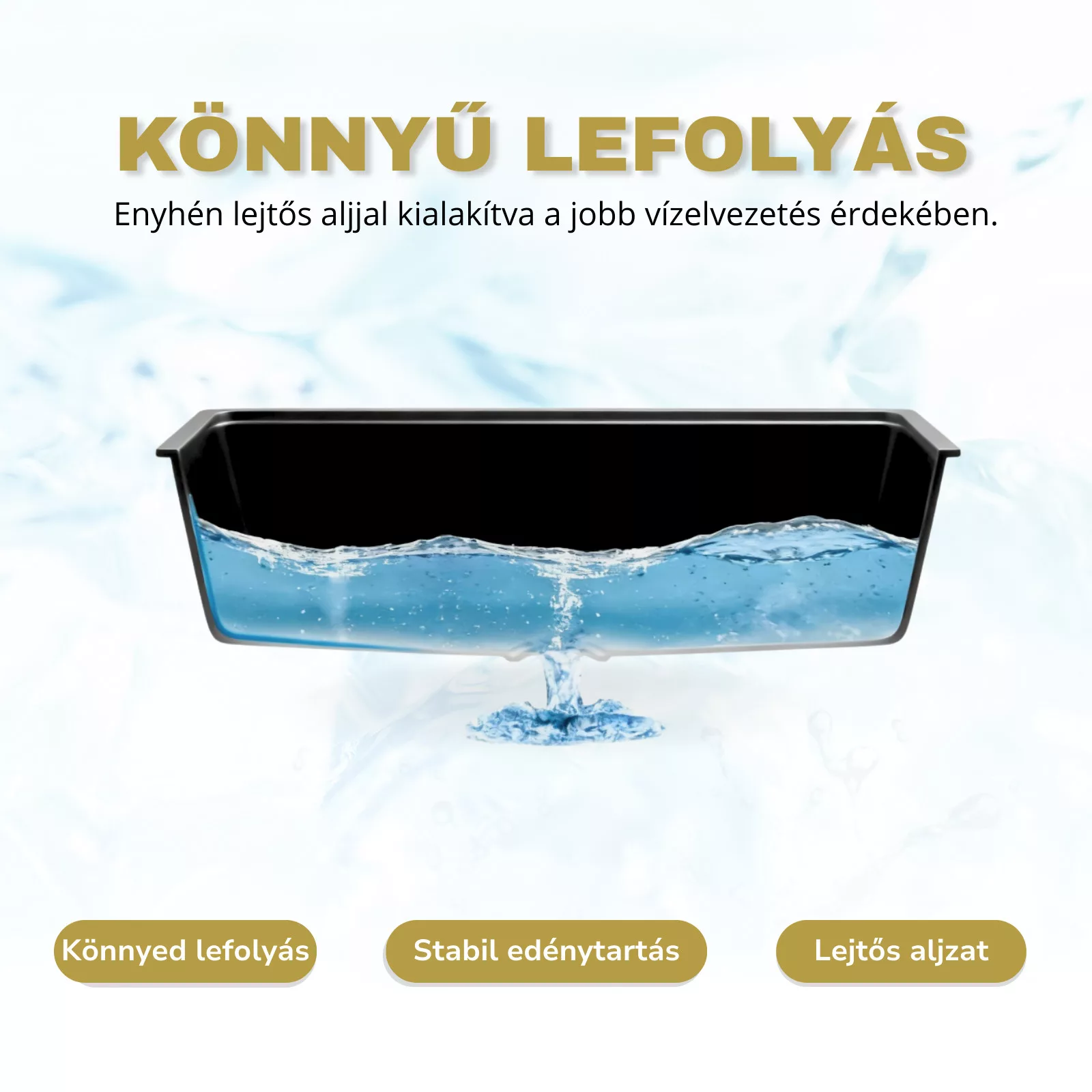 Mosogatónk magas természetes kőőrlemény-tartalmú gránit kompozitból készül, amely rendkívüli stabilitást és tartósságot biztosít. Az anyag ellenáll a magas hőmérsékletnek, a hirtelen hőingadozásoknak, valamint az ütéseknek és karcolásoknak is. Sima, zárt felülete könnyen tisztán tartható, ellenáll a foltosodásnak és az elszíneződéseknek, így hosszú éveken át megőrzi esztétikus megjelenését. Meggyőződésünk, hogy ezzel a gránit mosogatóval a mindennapi konyhai teendők kényelmesebbé és élvezetesebbé válnak.