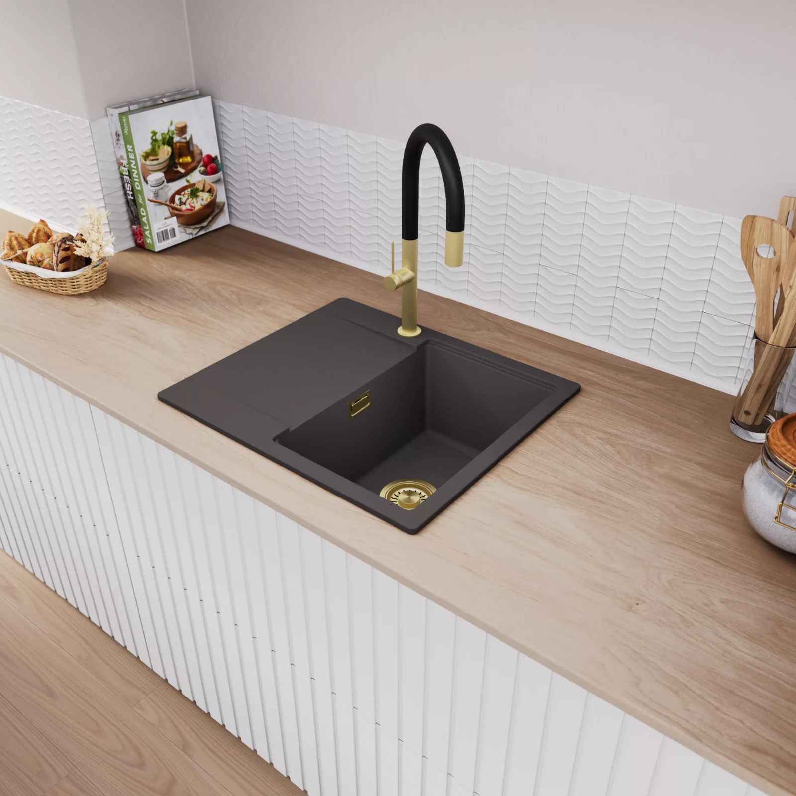A mosogató prémium minőségű gránit kompozitból készült, amely kiváló ellenállást biztosít a mindennapi használat során keletkező karcolásokkal szemben. A strapabíró gránit felület hosszú távon is megőrzi esztétikus megjelenését, így a mosogató intenzív igénybevétel mellett is megmarad újszerű állapotában.