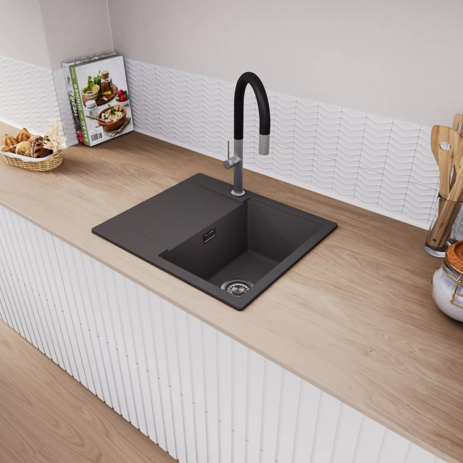 A mosogató prémium minőségű gránit kompozitból készült, amely kiváló ellenállást biztosít a mindennapi használat során keletkező karcolásokkal szemben. A strapabíró gránit felület hosszú távon is megőrzi esztétikus megjelenését, így a mosogató intenzív igénybevétel mellett is megmarad újszerű állapotában.