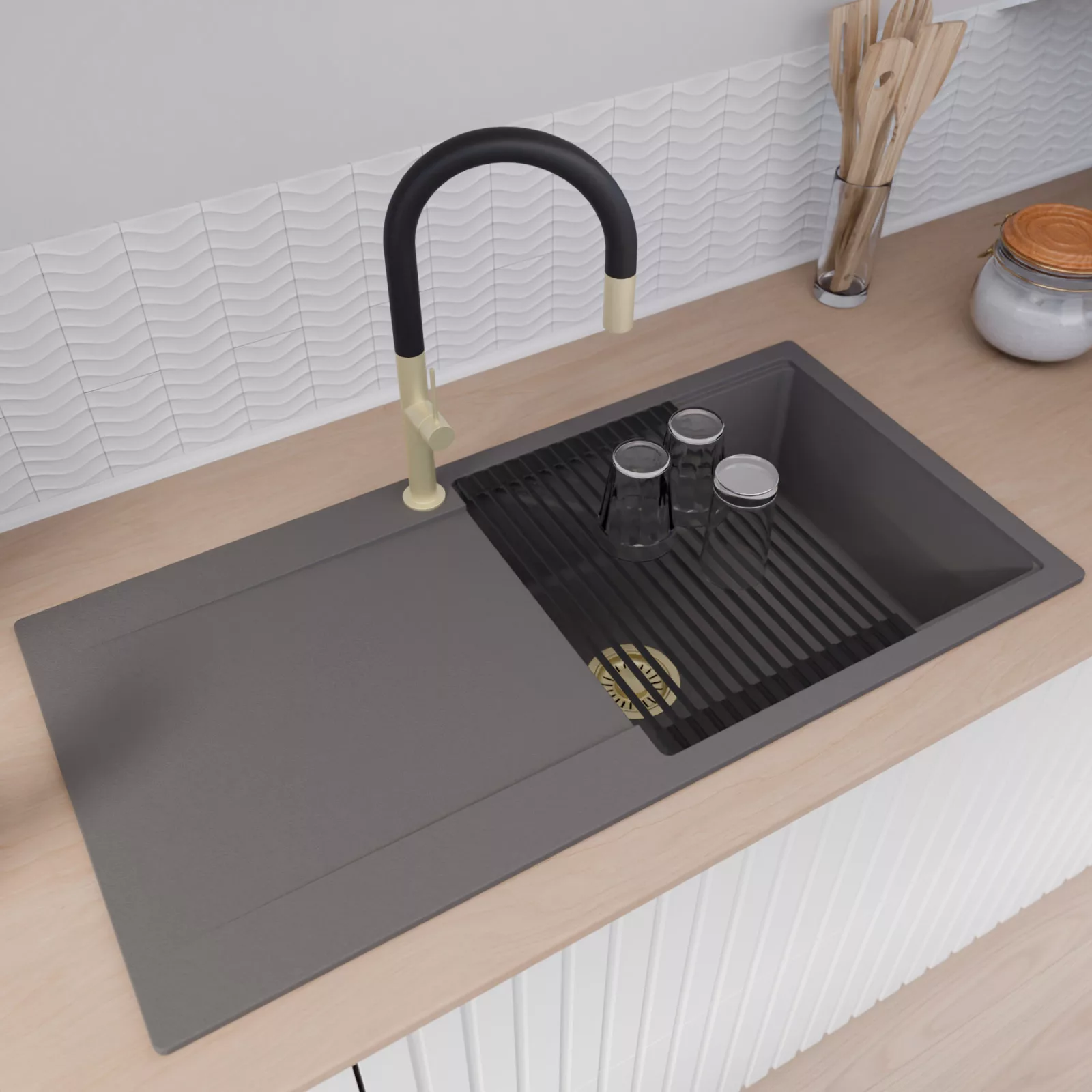 A mosogató prémium minőségű gránit kompozitból készült. Letisztult megjelenése mellett rendkívül praktikus, így bármilyen stílusú konyhába harmonikusan illeszkedik. A strapabíró gránit anyag hosszú távon is megbízható használatot garantál.