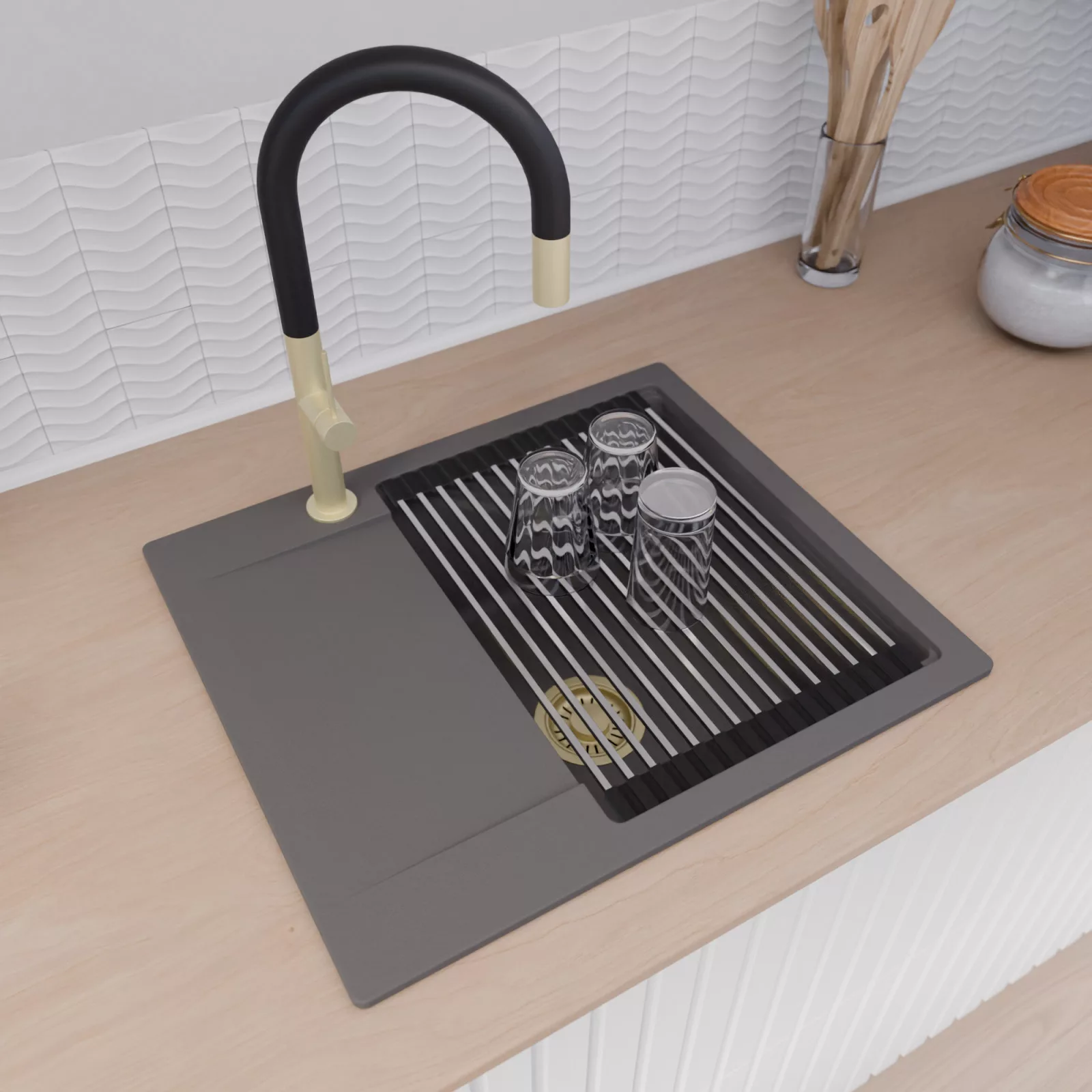 A mosogató prémium minőségű gránit kompozitból készült. Letisztult megjelenése mellett rendkívül praktikus, így bármilyen stílusú konyhába harmonikusan illeszkedik. A strapabíró gránit anyag hosszú távon is megbízható használatot garantál.