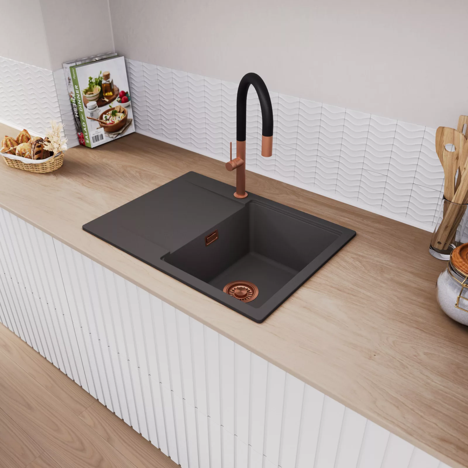 A mosogató prémium minőségű gránit kompozitból készült. Letisztult megjelenése mellett rendkívül praktikus, így bármilyen stílusú konyhába harmonikusan illeszkedik. A strapabíró gránit anyag hosszú távon is megbízható használatot garantál.