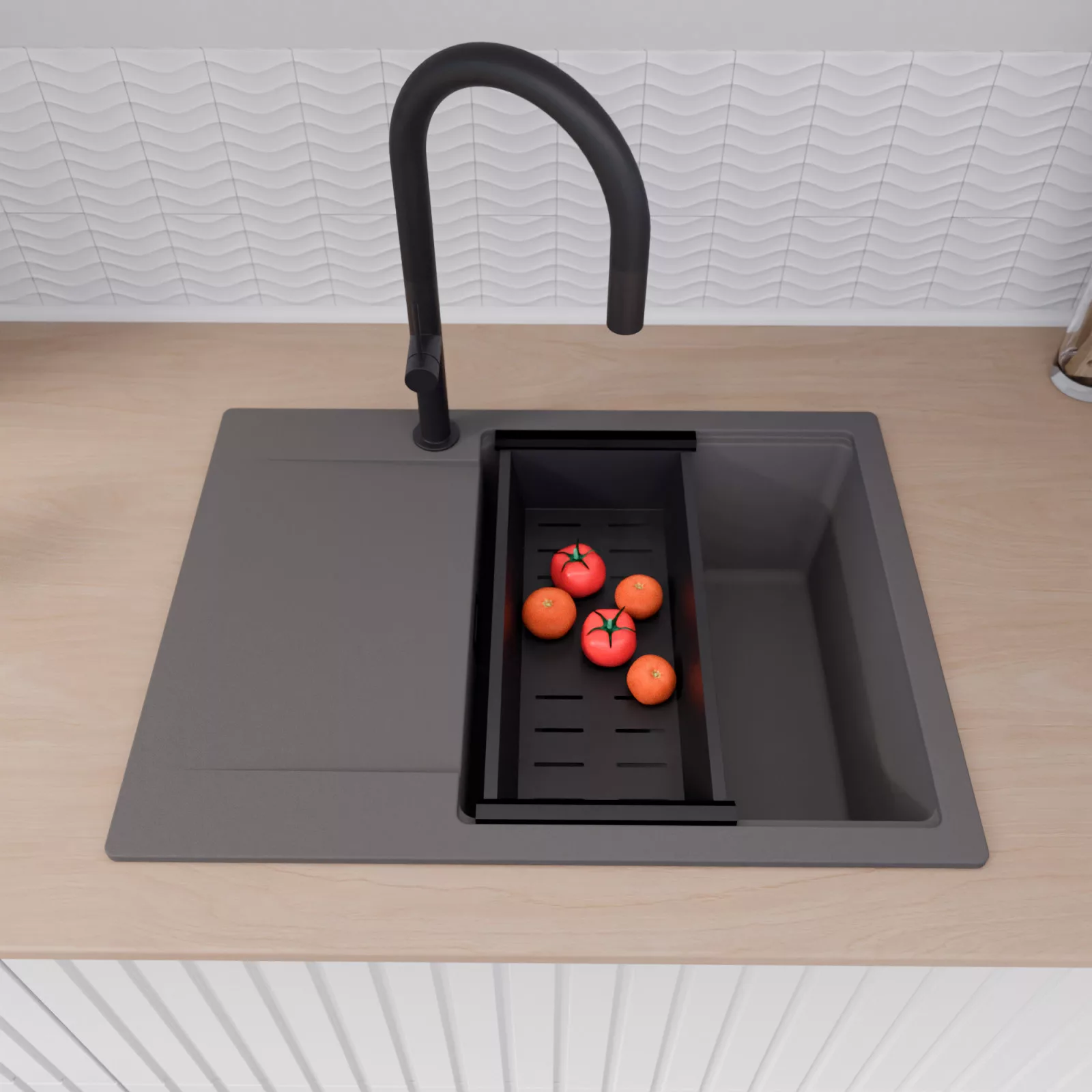 A mosogató prémium minőségű gránit kompozitból készült. Letisztult megjelenése mellett rendkívül praktikus, így bármilyen stílusú konyhába harmonikusan illeszkedik. A strapabíró gránit anyag hosszú távon is megbízható használatot garantál.