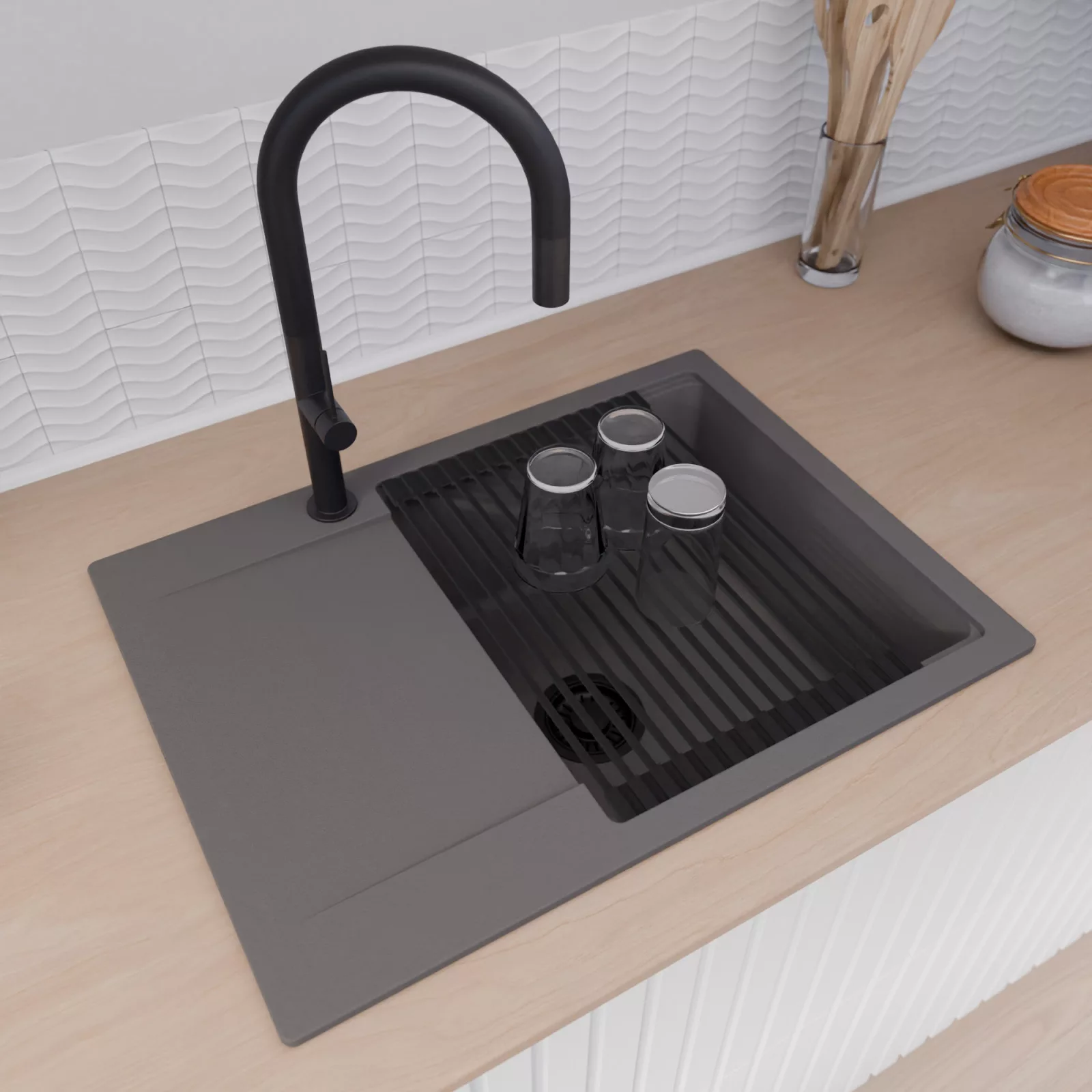 A mosogató prémium minőségű gránit kompozitból készült. Letisztult megjelenése mellett rendkívül praktikus, így bármilyen stílusú konyhába harmonikusan illeszkedik. A strapabíró gránit anyag hosszú távon is megbízható használatot garantál.