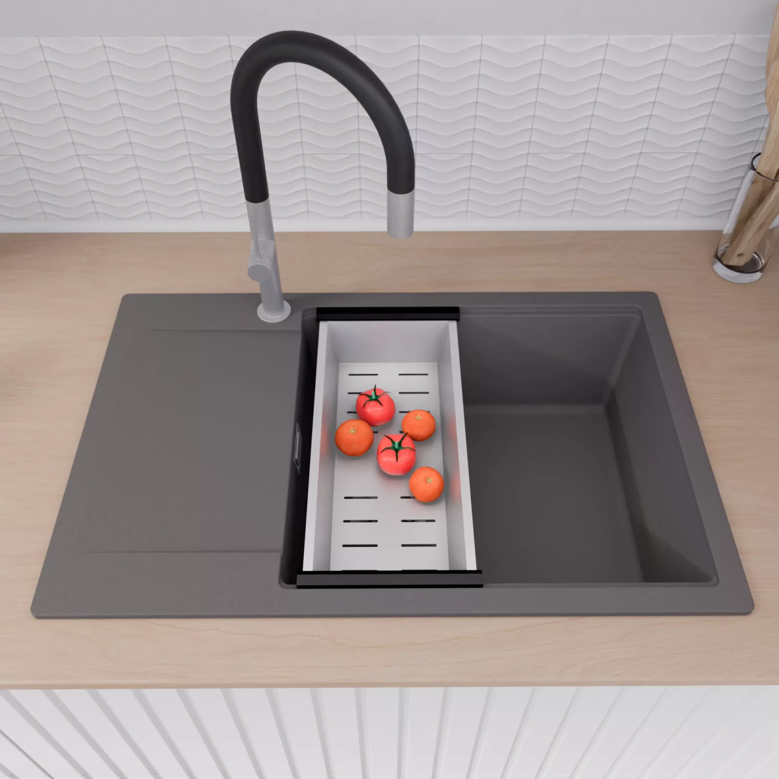 A mosogató prémium minőségű gránit kompozitból készült. Letisztult megjelenése mellett rendkívül praktikus, így bármilyen stílusú konyhába harmonikusan illeszkedik. A strapabíró gránit anyag hosszú távon is megbízható használatot garantál.