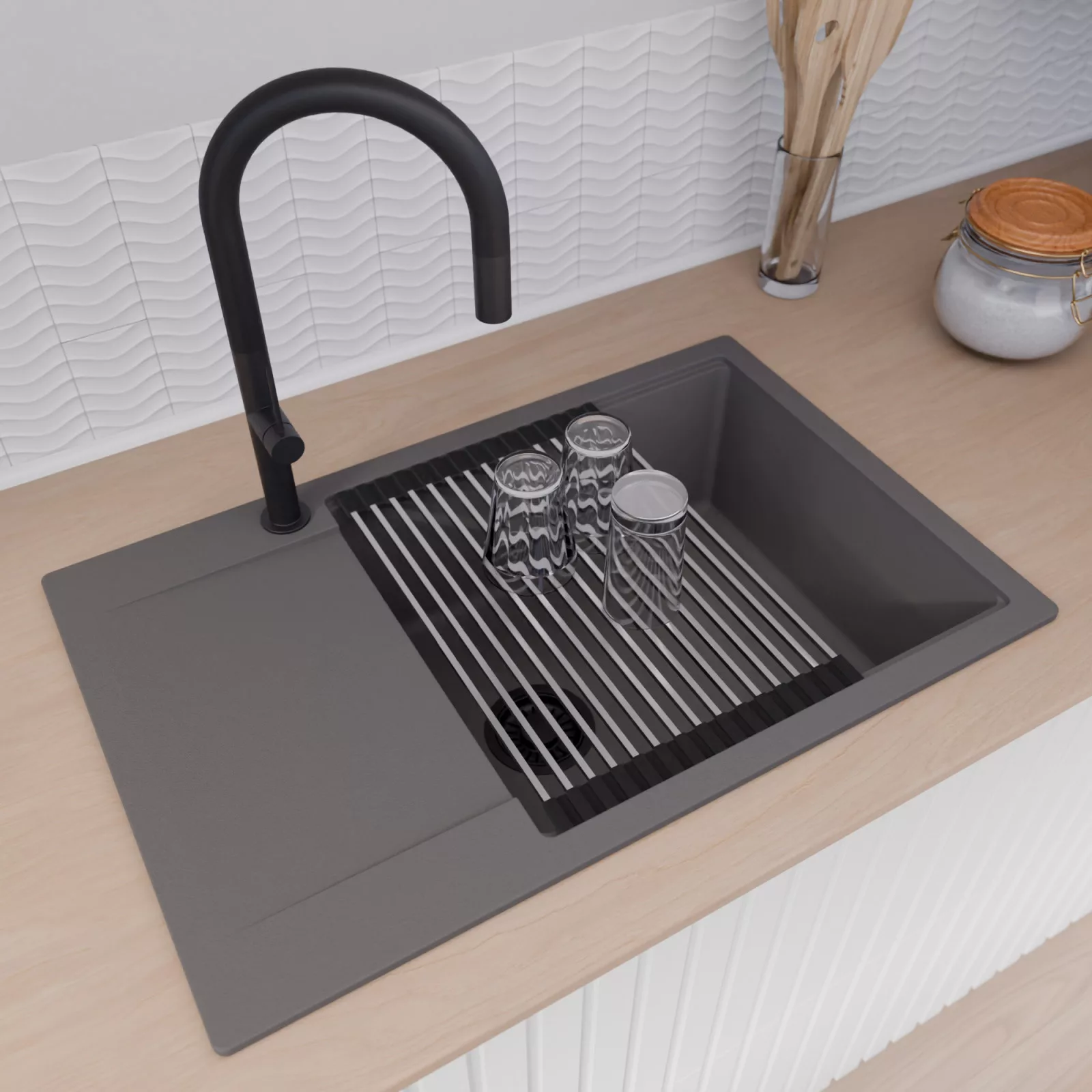 A mosogató prémium minőségű gránit kompozitból készült. Letisztult megjelenése mellett rendkívül praktikus, így bármilyen stílusú konyhába harmonikusan illeszkedik. A strapabíró gránit anyag hosszú távon is megbízható használatot garantál.