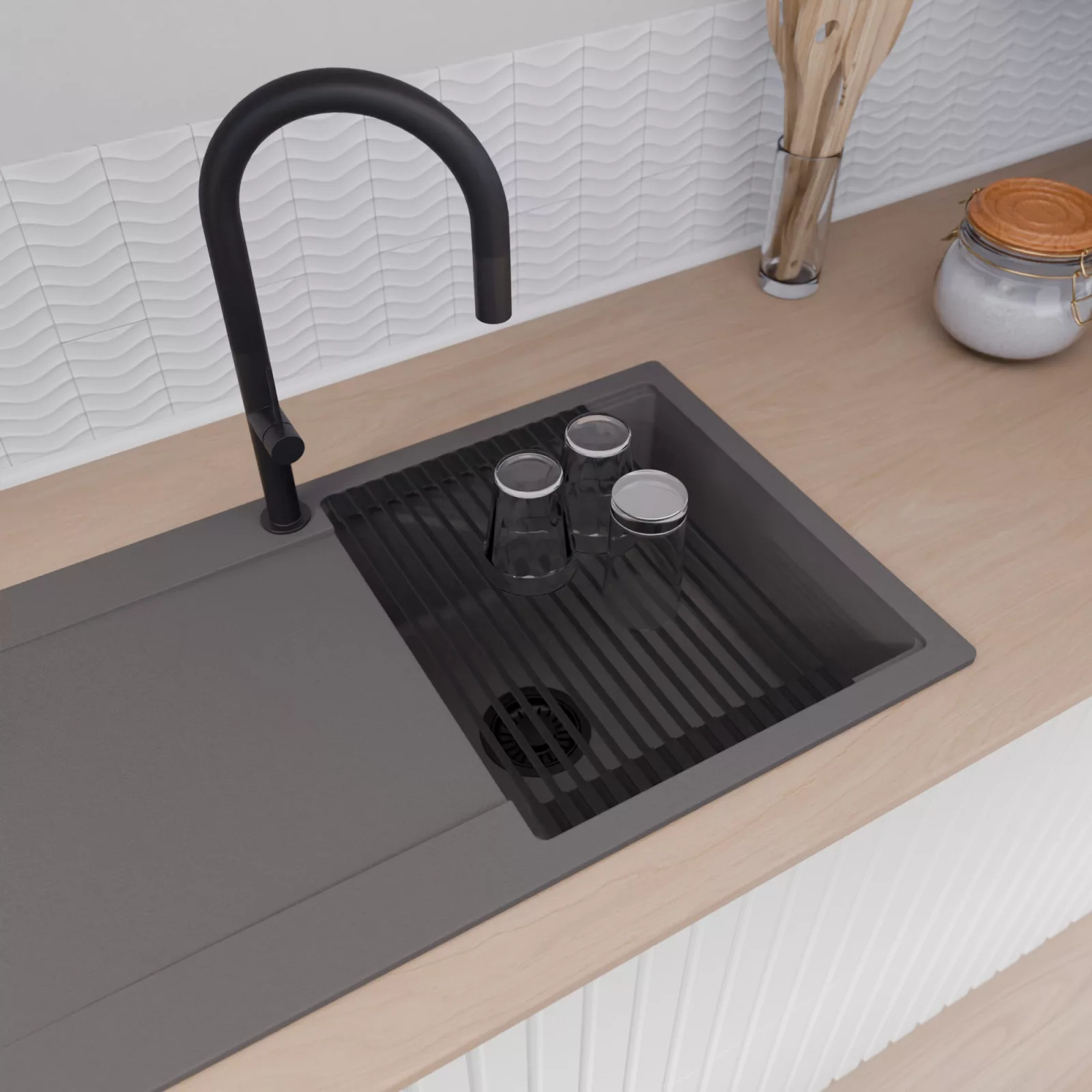 A mosogató prémium minőségű gránit kompozitból készült. Letisztult megjelenése mellett rendkívül praktikus, így bármilyen stílusú konyhába harmonikusan illeszkedik. A strapabíró gránit anyag hosszú távon is megbízható használatot garantál.