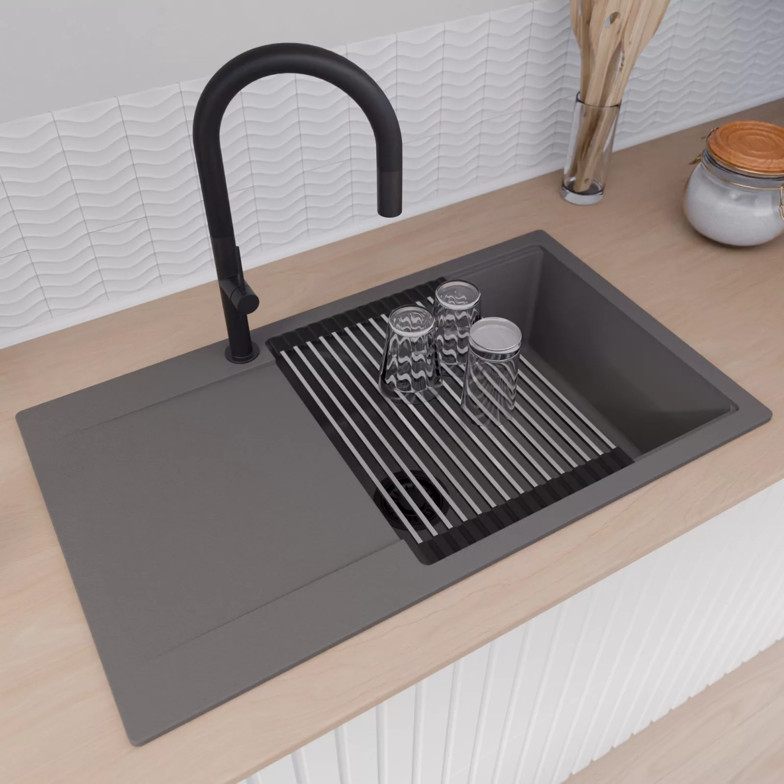 A mosogató prémium minőségű gránit kompozitból készült. Letisztult megjelenése mellett rendkívül praktikus, így bármilyen stílusú konyhába harmonikusan illeszkedik. A strapabíró gránit anyag hosszú távon is megbízható használatot garantál.