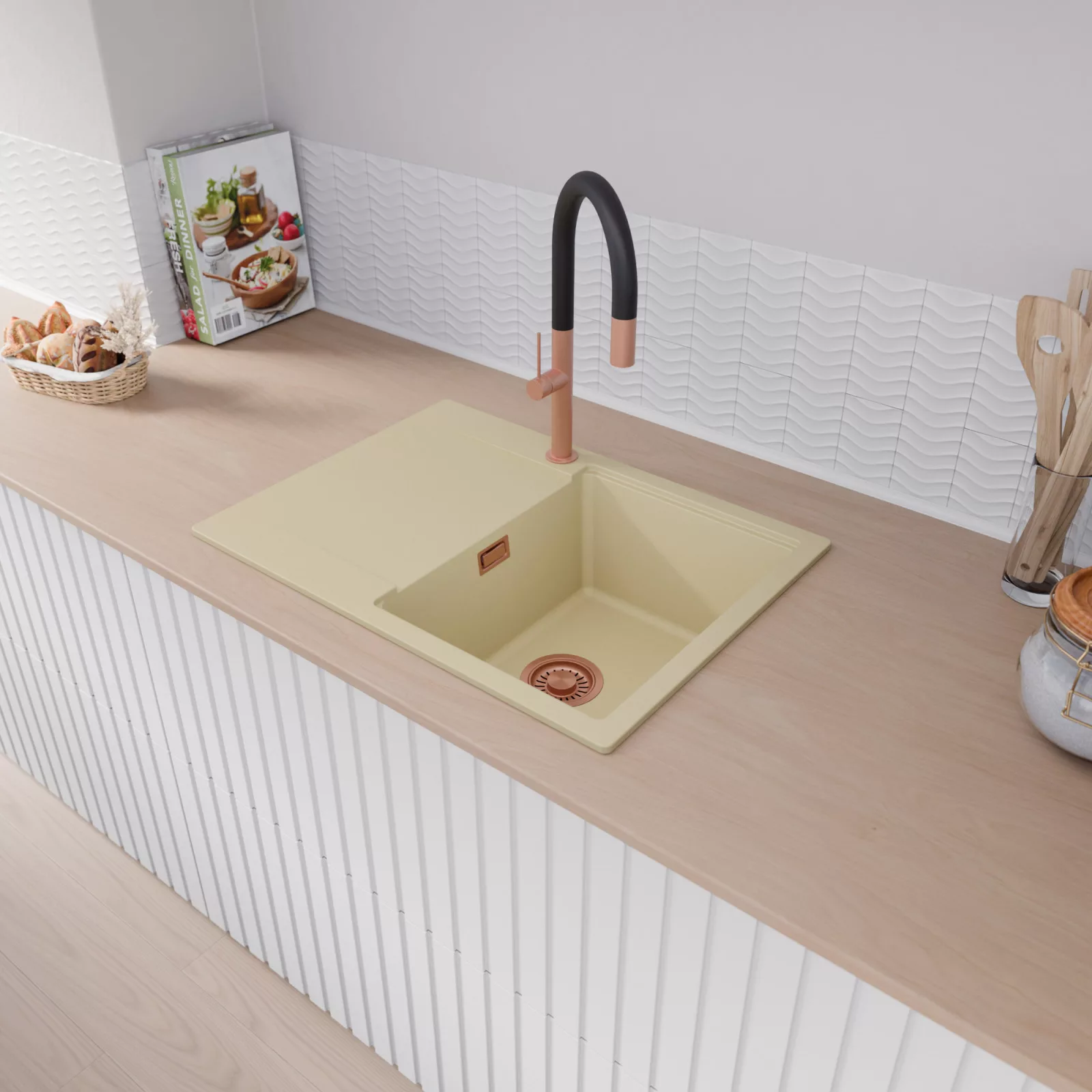 A mosogató prémium minőségű gránit kompozitból készült, amely kiváló ellenállást biztosít a mindennapi használat során keletkező karcolásokkal szemben. A strapabíró gránit felület hosszú távon is megőrzi esztétikus megjelenését, így a mosogató intenzív igénybevétel mellett is megmarad újszerű állapotában.