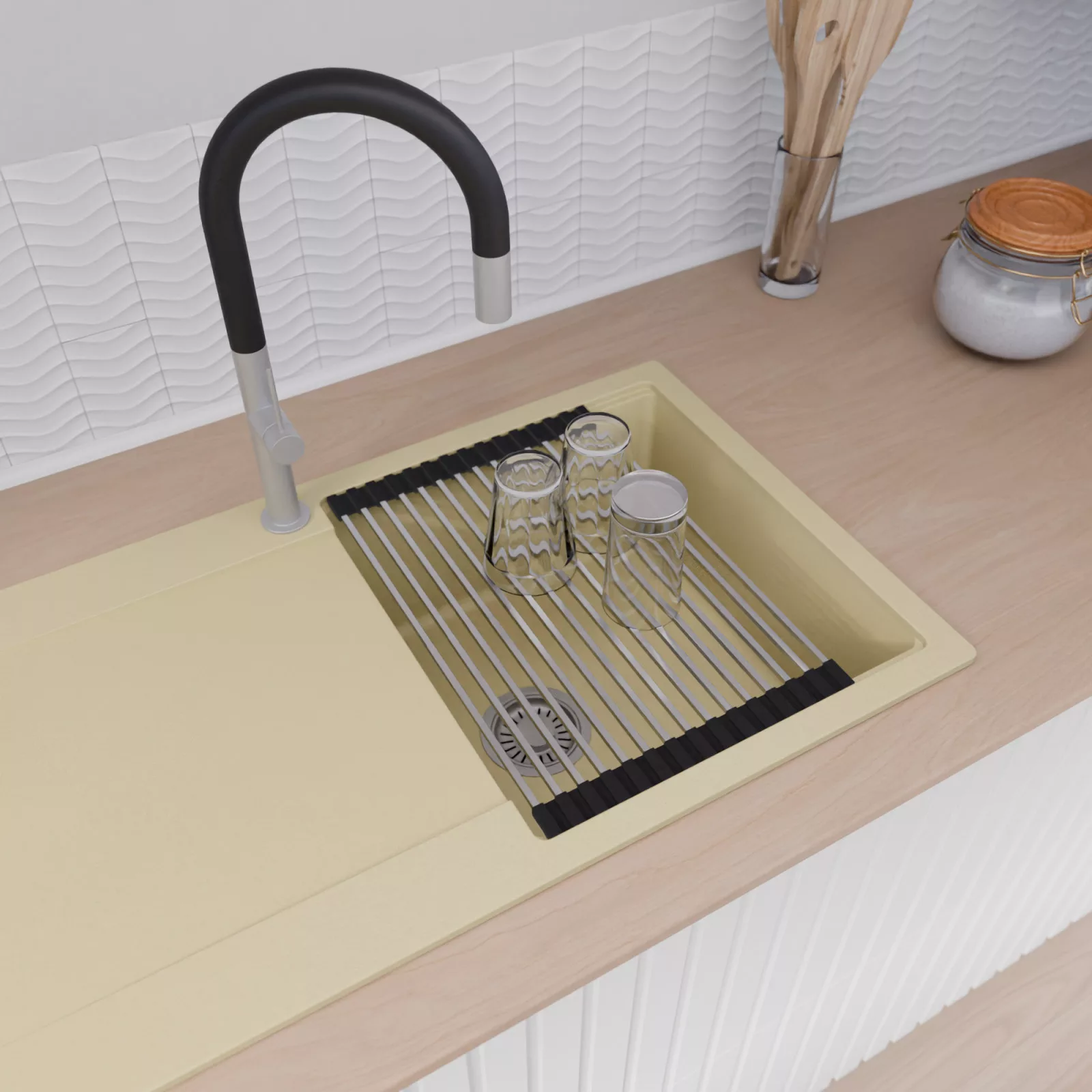 A mosogató prémium minőségű gránit kompozitból készült. Letisztult megjelenése mellett rendkívül praktikus, így bármilyen stílusú konyhába harmonikusan illeszkedik. A strapabíró gránit anyag hosszú távon is megbízható használatot garantál.