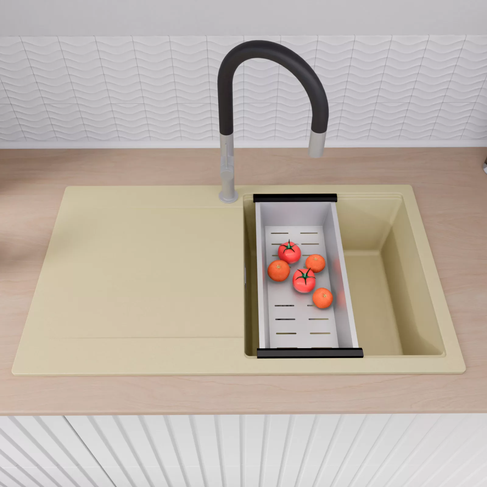Mosogatónk magas természetes kőőrlemény-tartalmú gránit kompozitból készül, amely rendkívüli stabilitást és tartósságot biztosít. Az anyag ellenáll a magas hőmérsékletnek, a hirtelen hőingadozásoknak, valamint az ütéseknek és karcolásoknak is. Sima, zárt felülete könnyen tisztán tartható, ellenáll a foltosodásnak és az elszíneződéseknek, így hosszú éveken át megőrzi esztétikus megjelenését. Meggyőződésünk, hogy ezzel a gránit mosogatóval a mindennapi konyhai teendők kényelmesebbé és élvezetesebbé válnak.