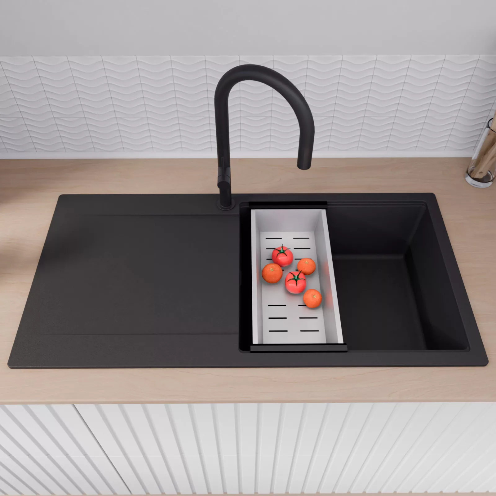 A mosogató prémium minőségű gránit kompozitból készült. Letisztult megjelenése mellett rendkívül praktikus, így bármilyen stílusú konyhába harmonikusan illeszkedik. A strapabíró gránit anyag hosszú távon is megbízható használatot garantál.