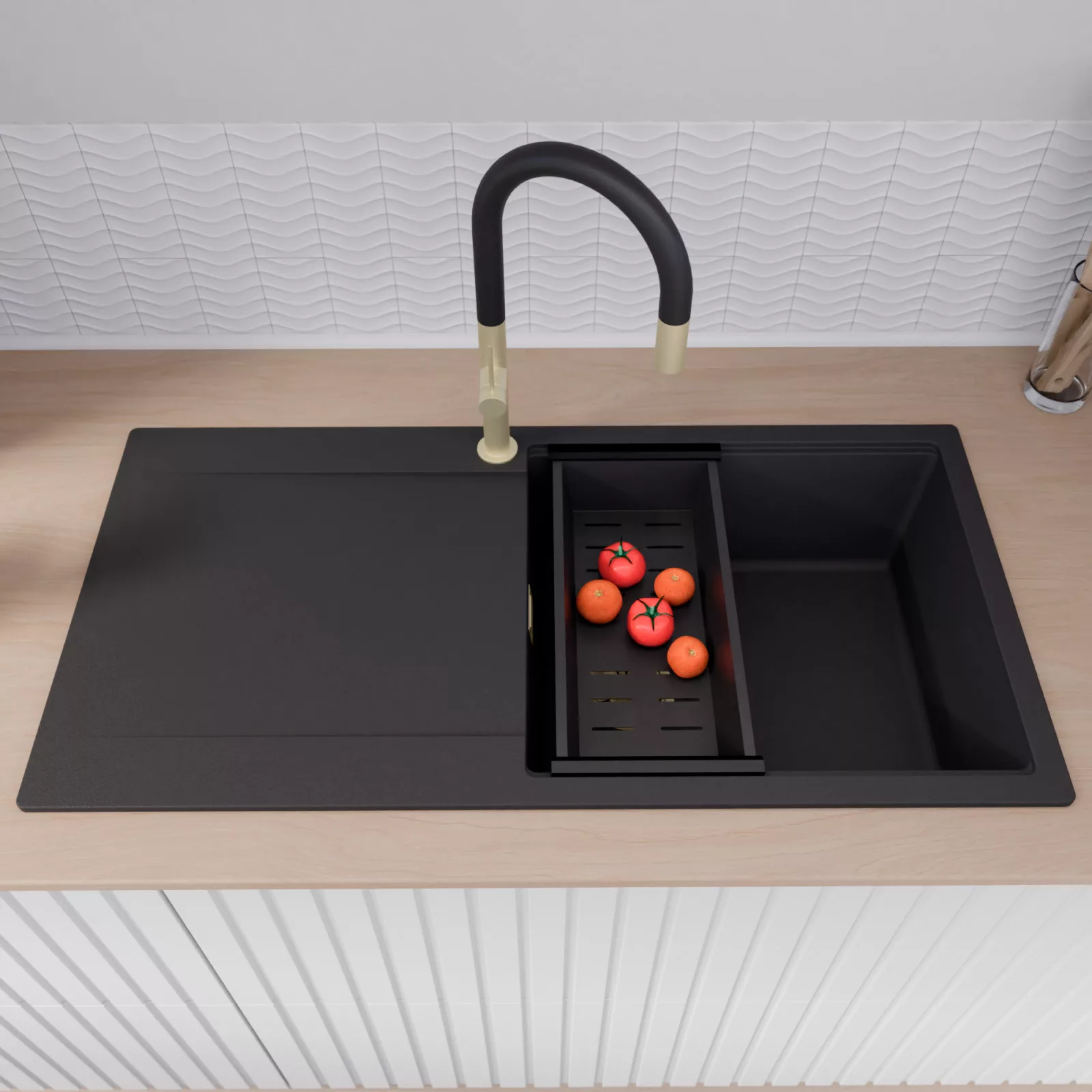 A mosogató prémium minőségű gránit kompozitból készült. Letisztult megjelenése mellett rendkívül praktikus, így bármilyen stílusú konyhába harmonikusan illeszkedik. A strapabíró gránit anyag hosszú távon is megbízható használatot garantál.