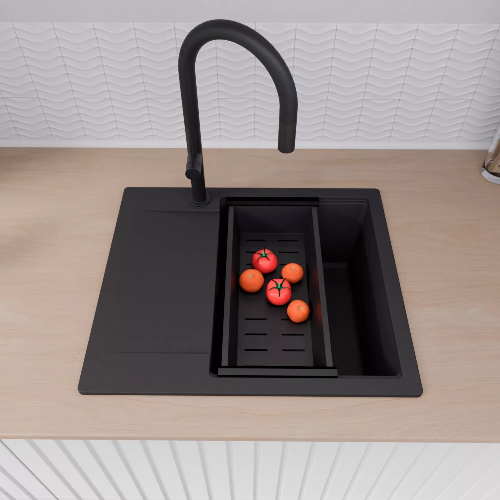 A mosogató prémium minőségű gránit kompozitból készült. Letisztult megjelenése mellett rendkívül praktikus, így bármilyen stílusú konyhába harmonikusan illeszkedik. A strapabíró gránit anyag hosszú távon is megbízható használatot garantál.