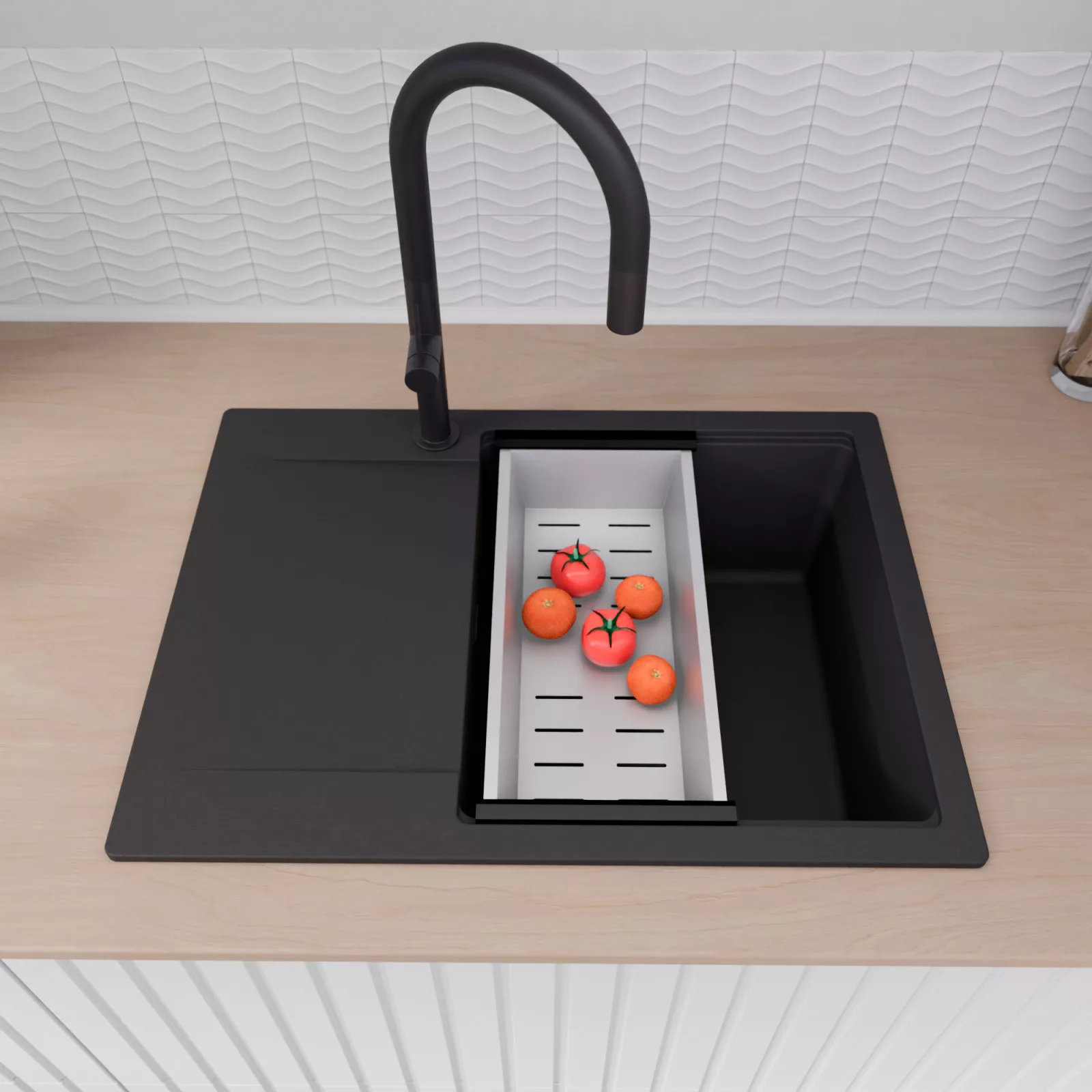 A mosogató prémium minőségű gránit kompozitból készült. Letisztult megjelenése mellett rendkívül praktikus, így bármilyen stílusú konyhába harmonikusan illeszkedik. A strapabíró gránit anyag hosszú távon is megbízható használatot garantál.