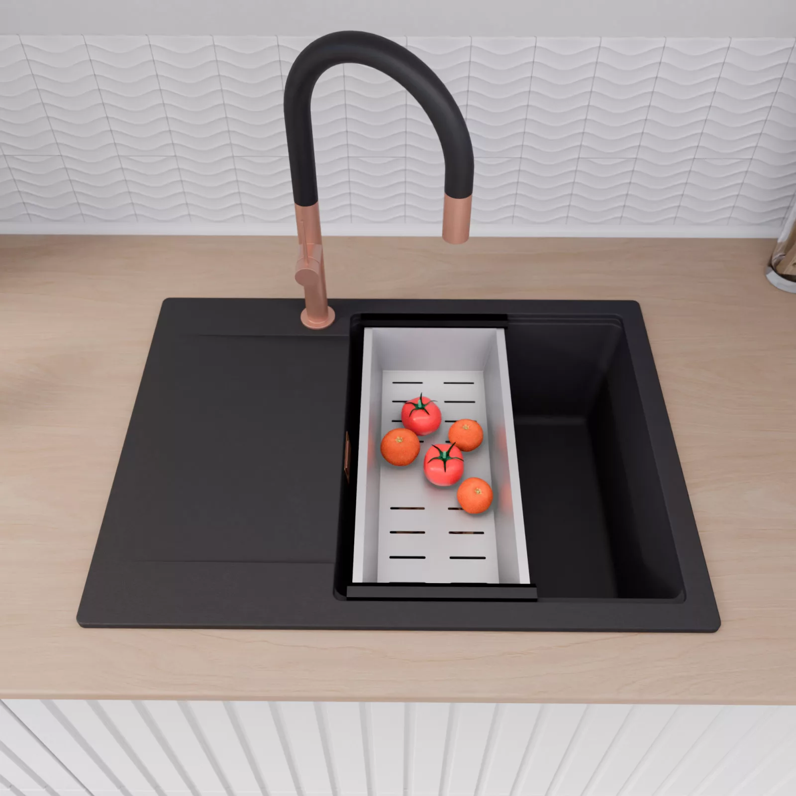 A mosogató prémium minőségű gránit kompozitból készült. Letisztult megjelenése mellett rendkívül praktikus, így bármilyen stílusú konyhába harmonikusan illeszkedik. A strapabíró gránit anyag hosszú távon is megbízható használatot garantál.