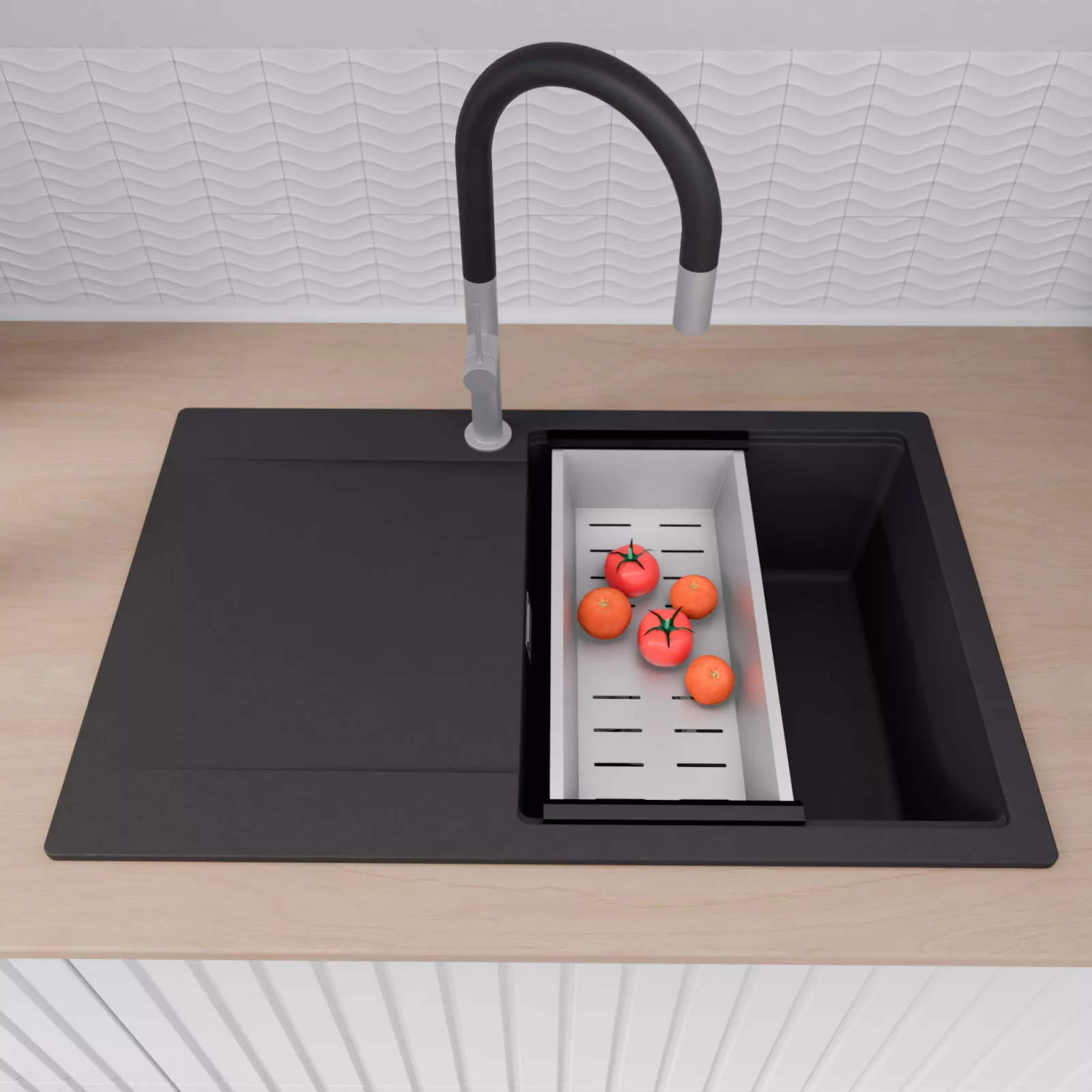 A mosogató prémium minőségű gránit kompozitból készült. Letisztult megjelenése mellett rendkívül praktikus, így bármilyen stílusú konyhába harmonikusan illeszkedik. A strapabíró gránit anyag hosszú távon is megbízható használatot garantál.