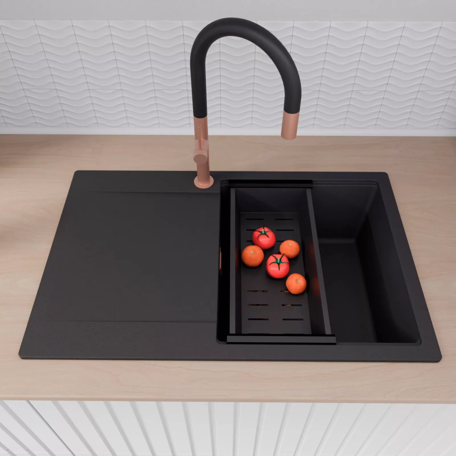 A mosogató prémium minőségű gránit kompozitból készült. Letisztult megjelenése mellett rendkívül praktikus, így bármilyen stílusú konyhába harmonikusan illeszkedik. A strapabíró gránit anyag hosszú távon is megbízható használatot garantál.