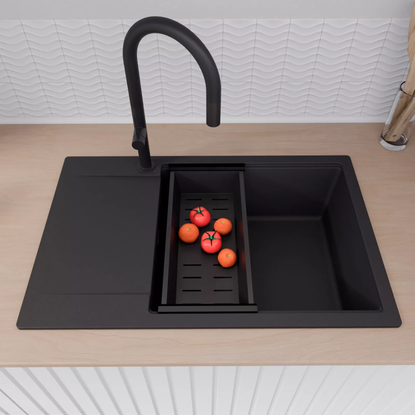 A mosogató prémium minőségű gránit kompozitból készült. Letisztult megjelenése mellett rendkívül praktikus, így bármilyen stílusú konyhába harmonikusan illeszkedik. A strapabíró gránit anyag hosszú távon is megbízható használatot garantál.