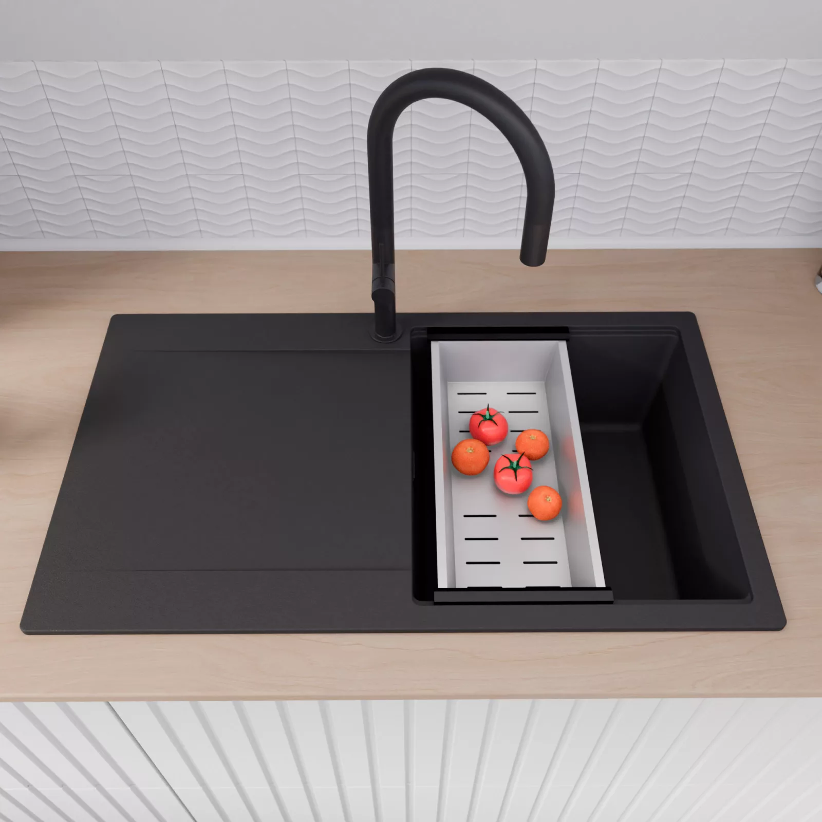A mosogató prémium minőségű gránit kompozitból készült. Letisztult megjelenése mellett rendkívül praktikus, így bármilyen stílusú konyhába harmonikusan illeszkedik. A strapabíró gránit anyag hosszú távon is megbízható használatot garantál.